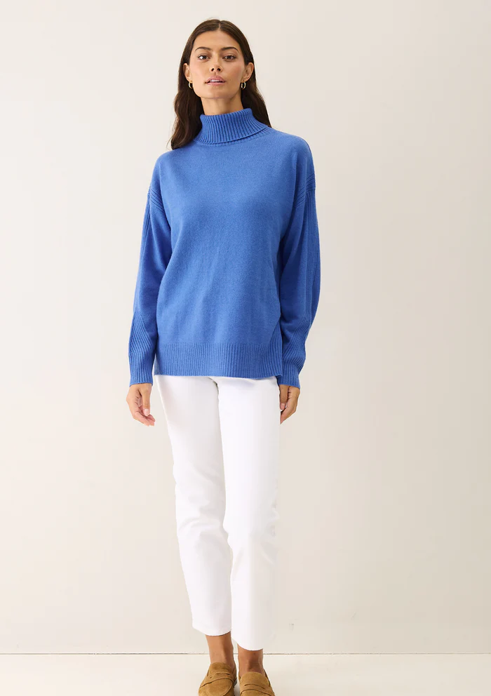 With it's precise chevron ribbed details to body and sleeves this relaxed sweater is refined and relaxed. With a high neck, relaxed body block and chic detailing it works from weekday to weekend. Crafted from 100% sustainable cashmere. Style in the same tone head to toe for a striking day look. Give ... Read more a nod to the 1970's with a wide leg jean and block heel boots and blazer.