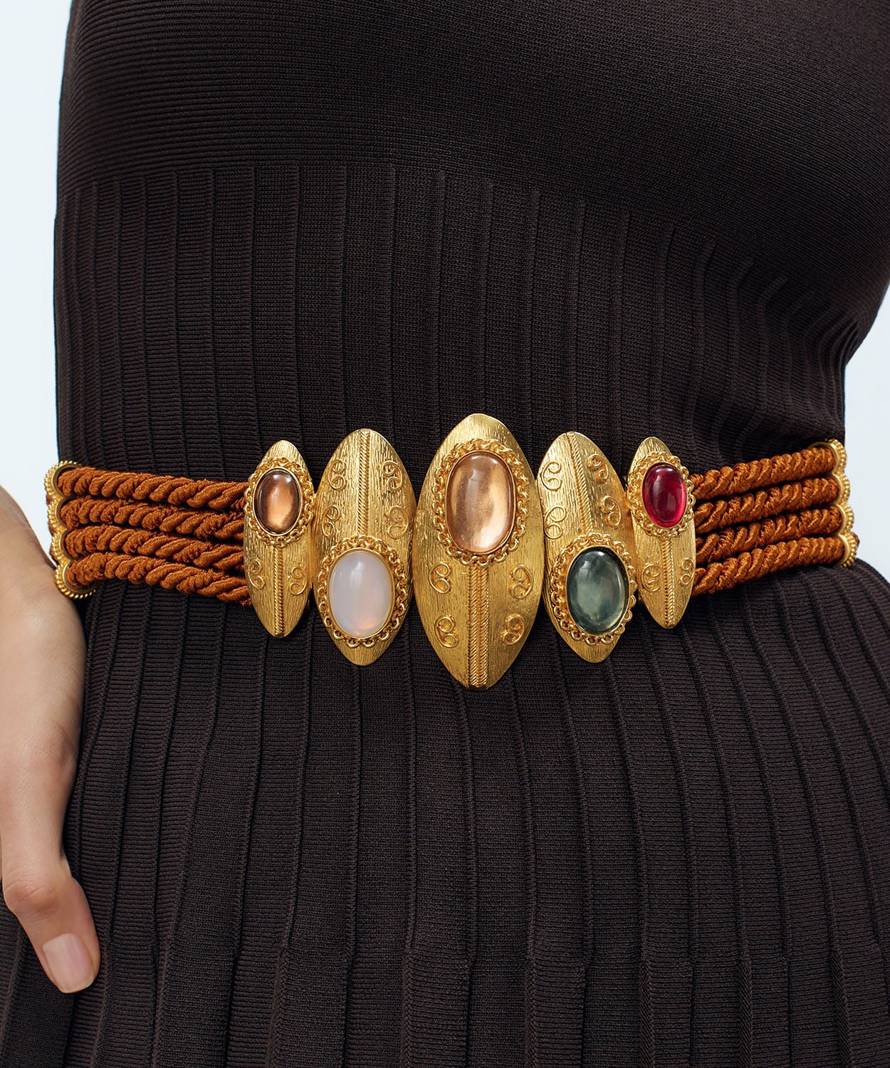 Designed as five oval shape shields, hand worked and decorated with applied wire work and rope twists. Each bezel is set with simulated glass cabochons, the colours ranging from purple, white, opaline, blue and pink set within a curb link frame. The luxurious finish can be paired with many styles - ... Read more a summer caftan, white trousers or pair of jean shorts - the choice is yours!