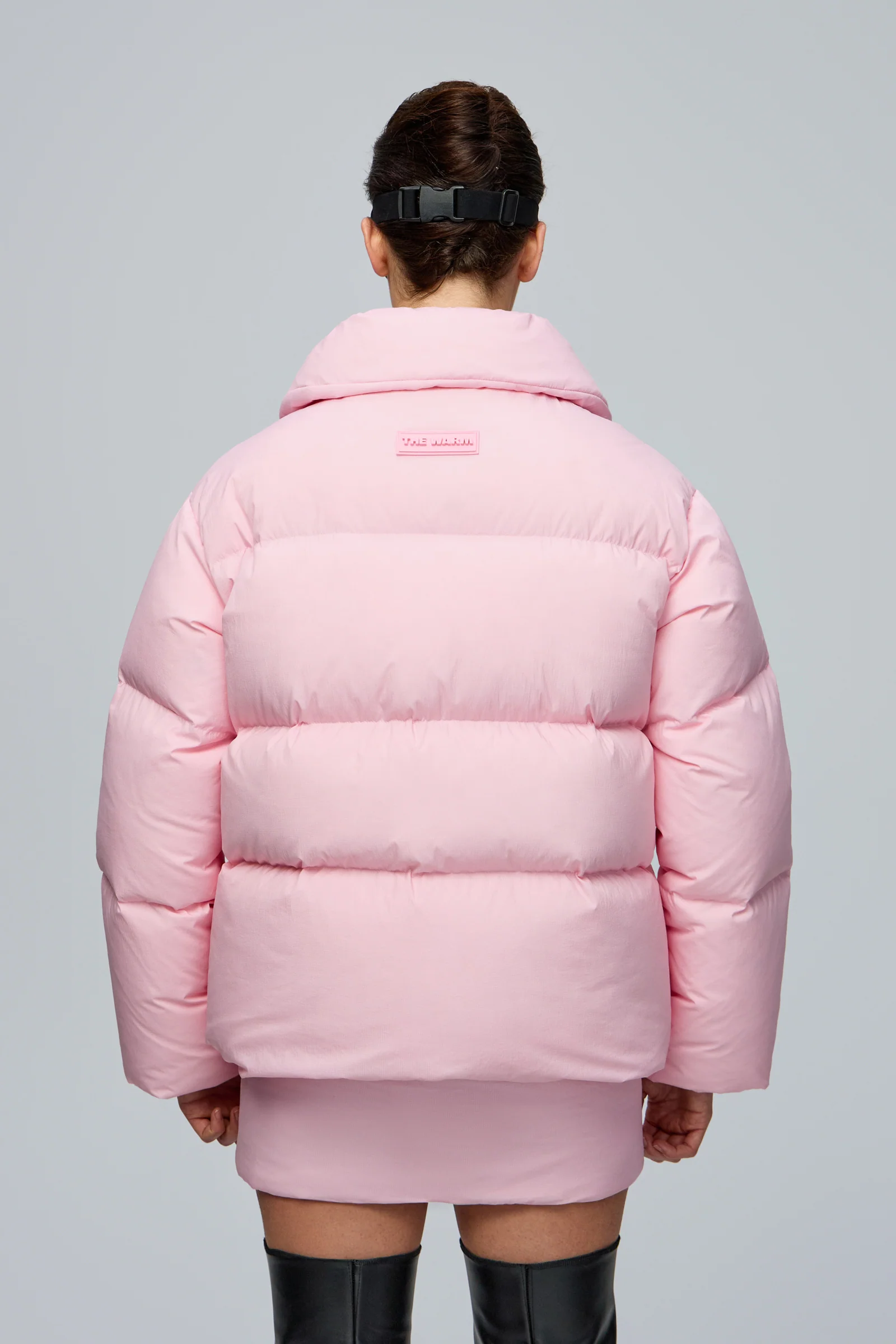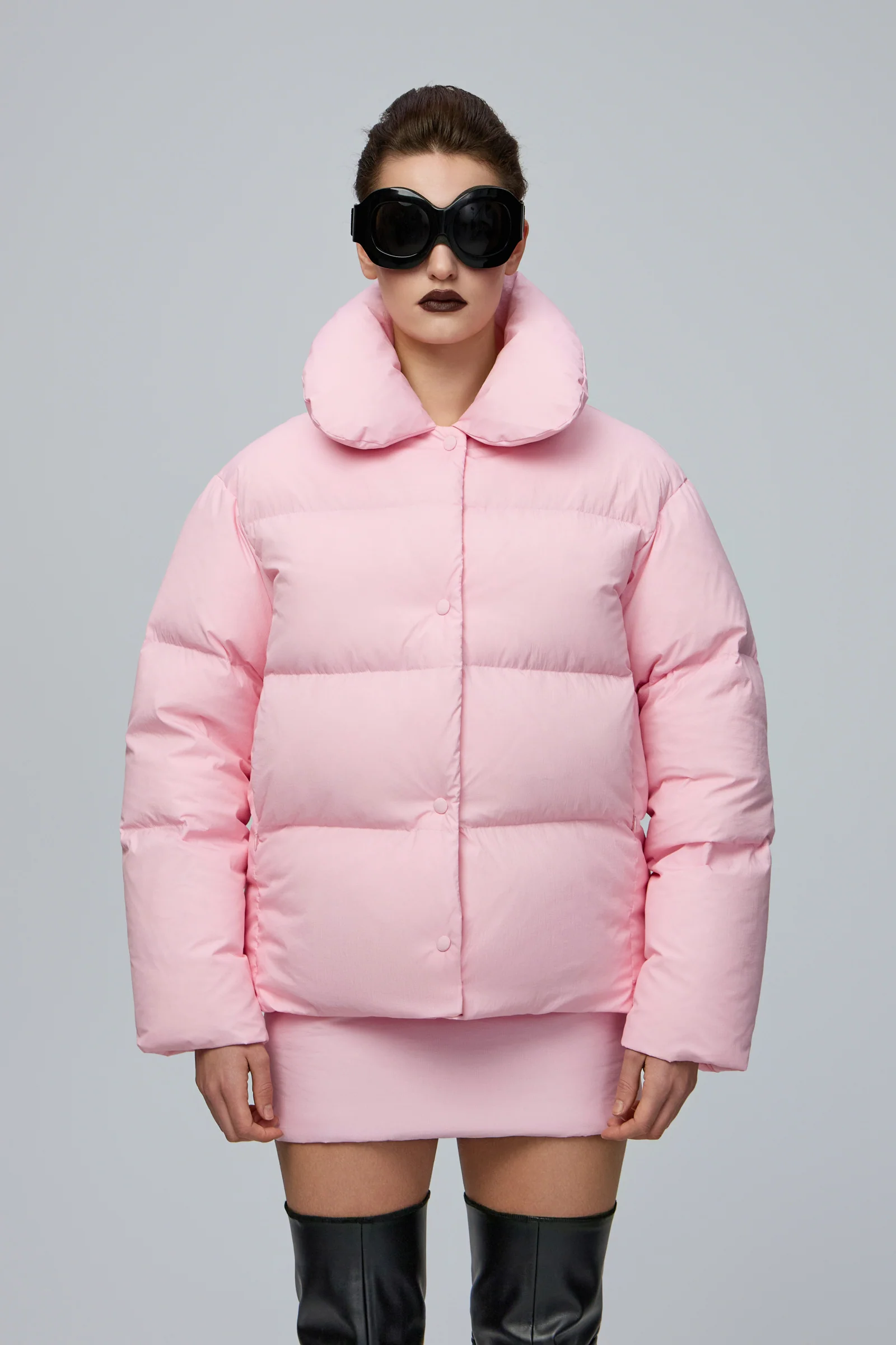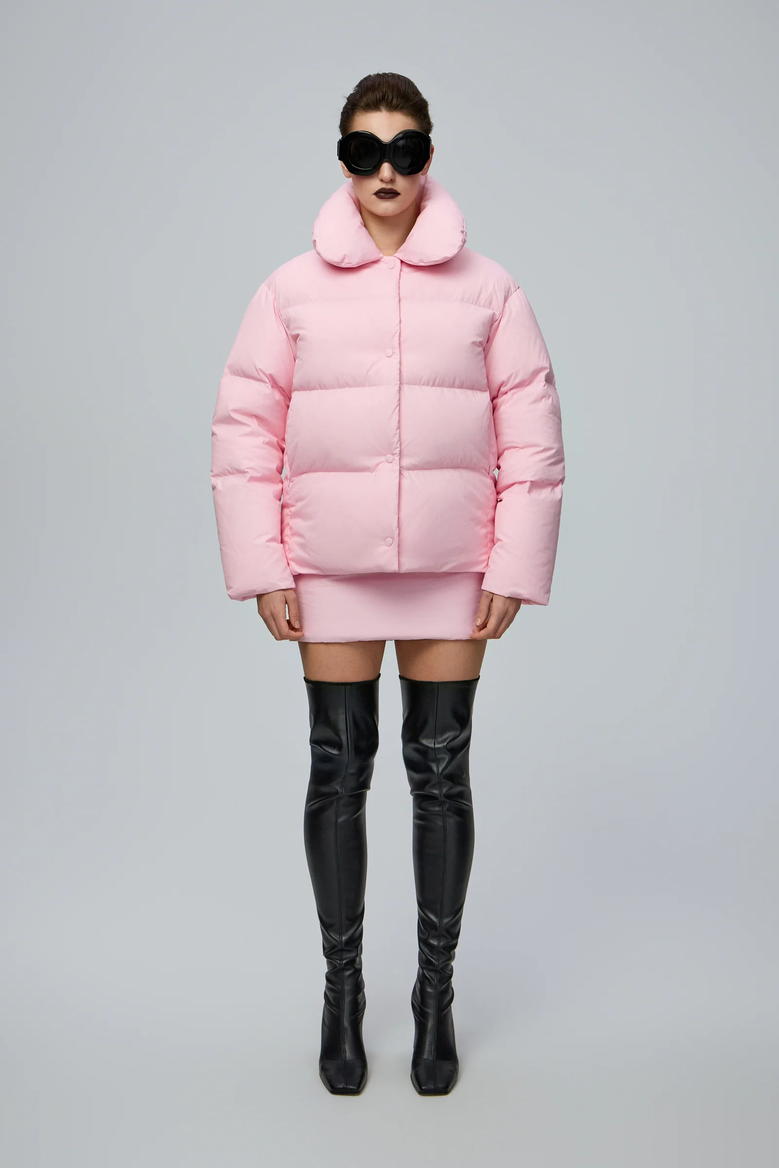 Wrap yourself in effortless edge with this ultra-modern pink puffer jacket, designed with a bold rounded collar and a sleek, sculpted silhouette. Its soft, voluminous padding delivers maximum warmth without compromising on style, while the smooth matte finish and minimal snap-button closure keep the ... Read more look refined. Perfect for elevating everyday winter dressing, this statement puffer brings together comfort, structure, and high-fashion attitude in one timeless essential.