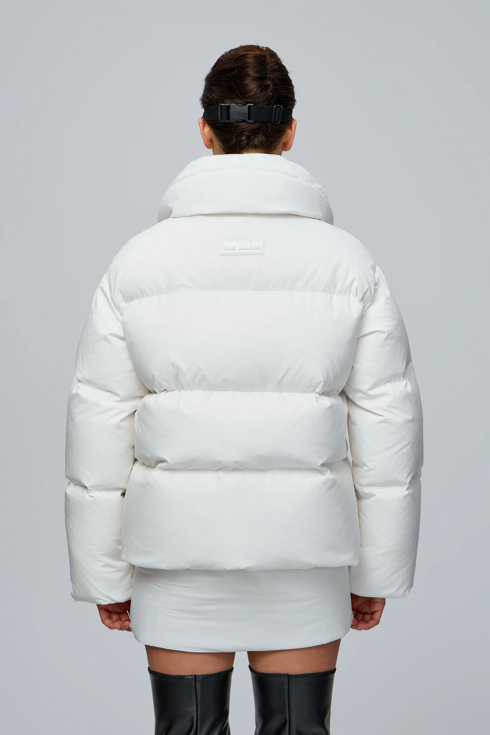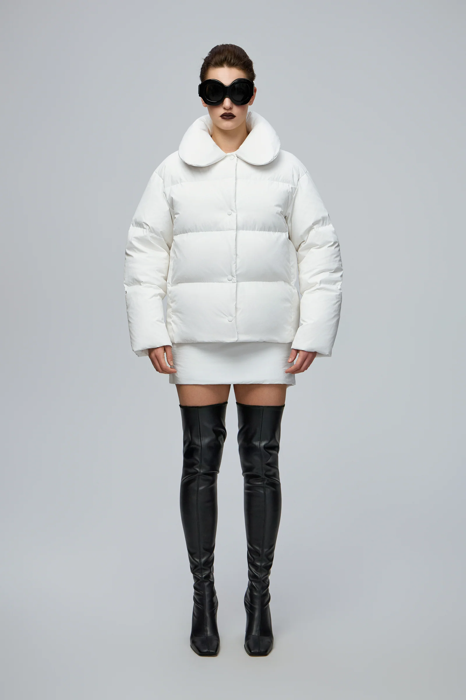 Wrap yourself in effortless edge with this ultra-modern white puffer jacket, designed with a bold rounded collar and a sleek, sculpted silhouette. Its soft, voluminous padding delivers maximum warmth without compromising on style, while the smooth matte finish and minimal snap-button closure keep ... Read more the look refined. Perfect for elevating everyday winter dressing, this statement puffer brings together comfort, structure, and high-fashion attitude in one timeless essential.