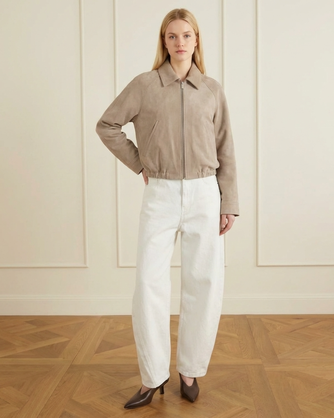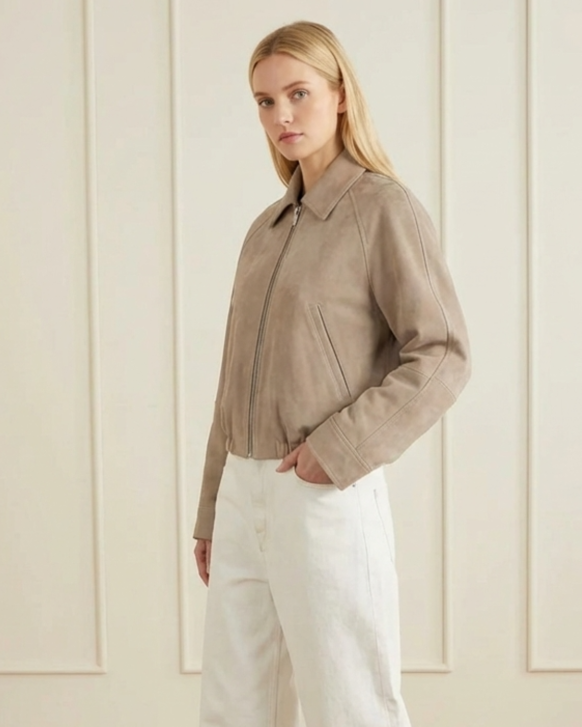 Made from high-quality double-faced suede for a refined finish, the Alba Suede Jacket is a luxurious, vintage-inspired staple crafted from rich, caramel toned suede. This cropped bomber features a clean zip-front closure, a classic pointed collar, and an elasticated waistband for a comfortable yet ... Read more structured silhouette. Its minimalist design and functional side pockets make it an effortless choice for elevated daily wear.