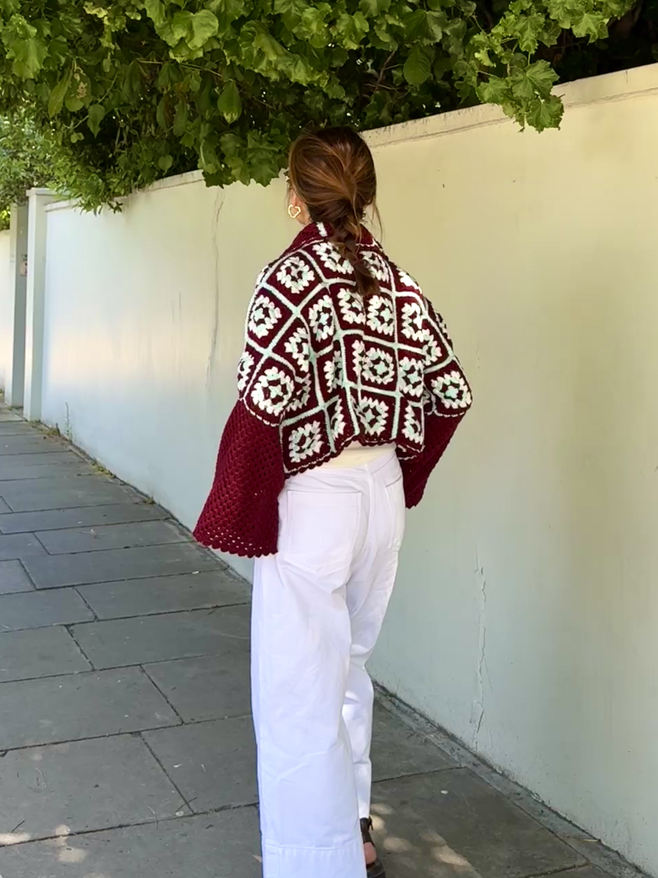 The Anya Jacket in burgundy and aqua has a bold, retro aesthetic with a modern twist. It features a rich burgundy colour with aqua and white crochet square patterns throughout the body of the jacket. The design is reminiscent of a vintage patchwork style, with a cozy, handmade feel. The large ... Read more sleeves are burgundy with a textured, crochet-like pattern that adds volume and drama to the overall look. The jacket closes with a couple of buttons, giving it a casual yet stylish vibe, perfect for layering over a basic top or turtleneck. This piece stands out due to its playful mix of colours and textures, combining warmth and fashion effortlessly.Availability: Upon order - Takes 3 to 5 weeks of work