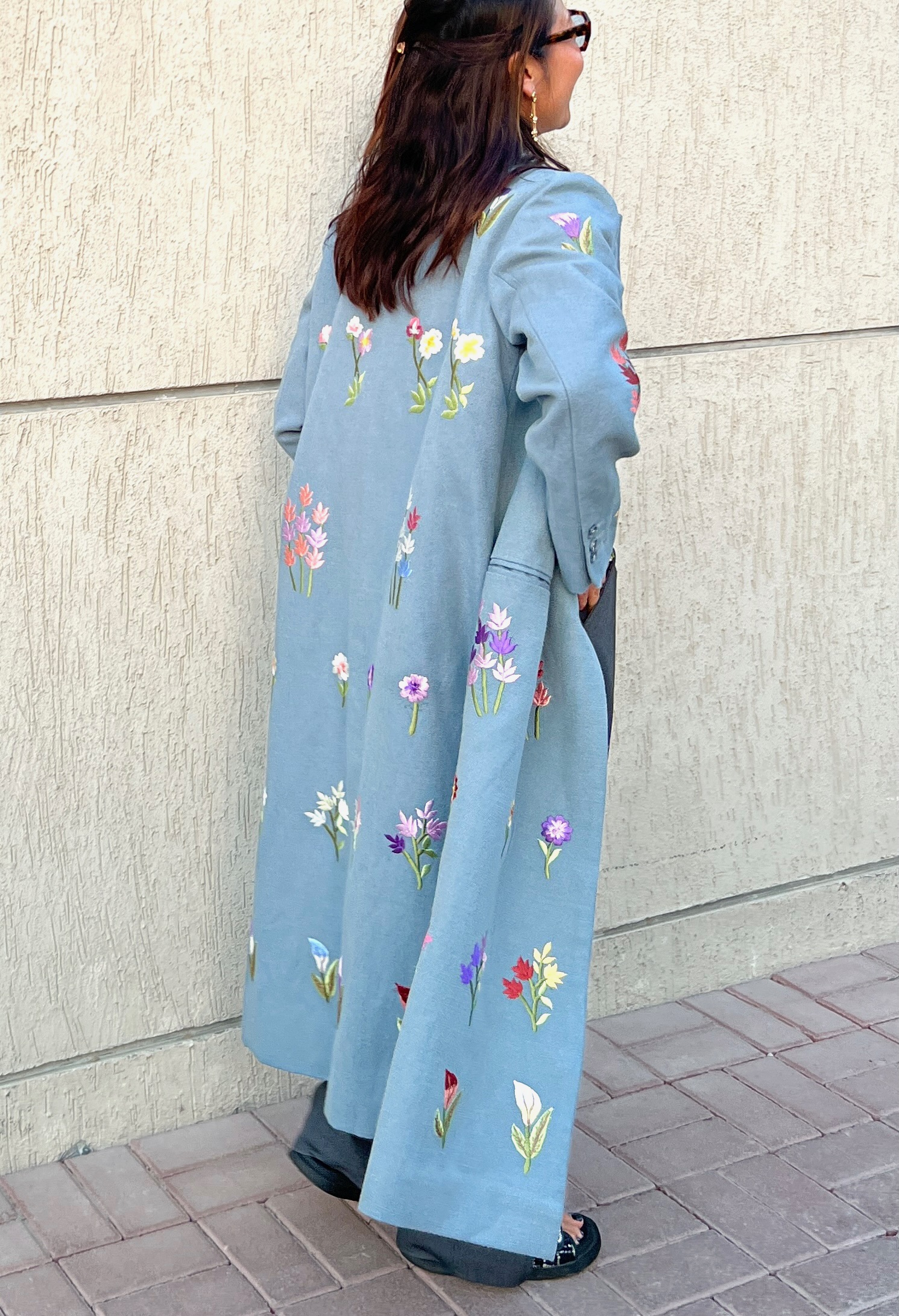 Embrace sophistication and style with the Embroidered Flower Coat in Blue from Artwear Gallery. The lightweight yet durable linen makes it perfect for all seasons, offering versatility and practicality in one stunning piece. Whether you're strolling through the city streets or attending a soirée, ... Read more this coat effortlessly elevates any outfit with its unmatched allure and craftsmanship. Its tailored silhouette flatters every figure, while the timeless design ensures it remains a cherished wardrobe staple for years to come.| For customisation enquiries, please DM, whatsApp or email us directly |