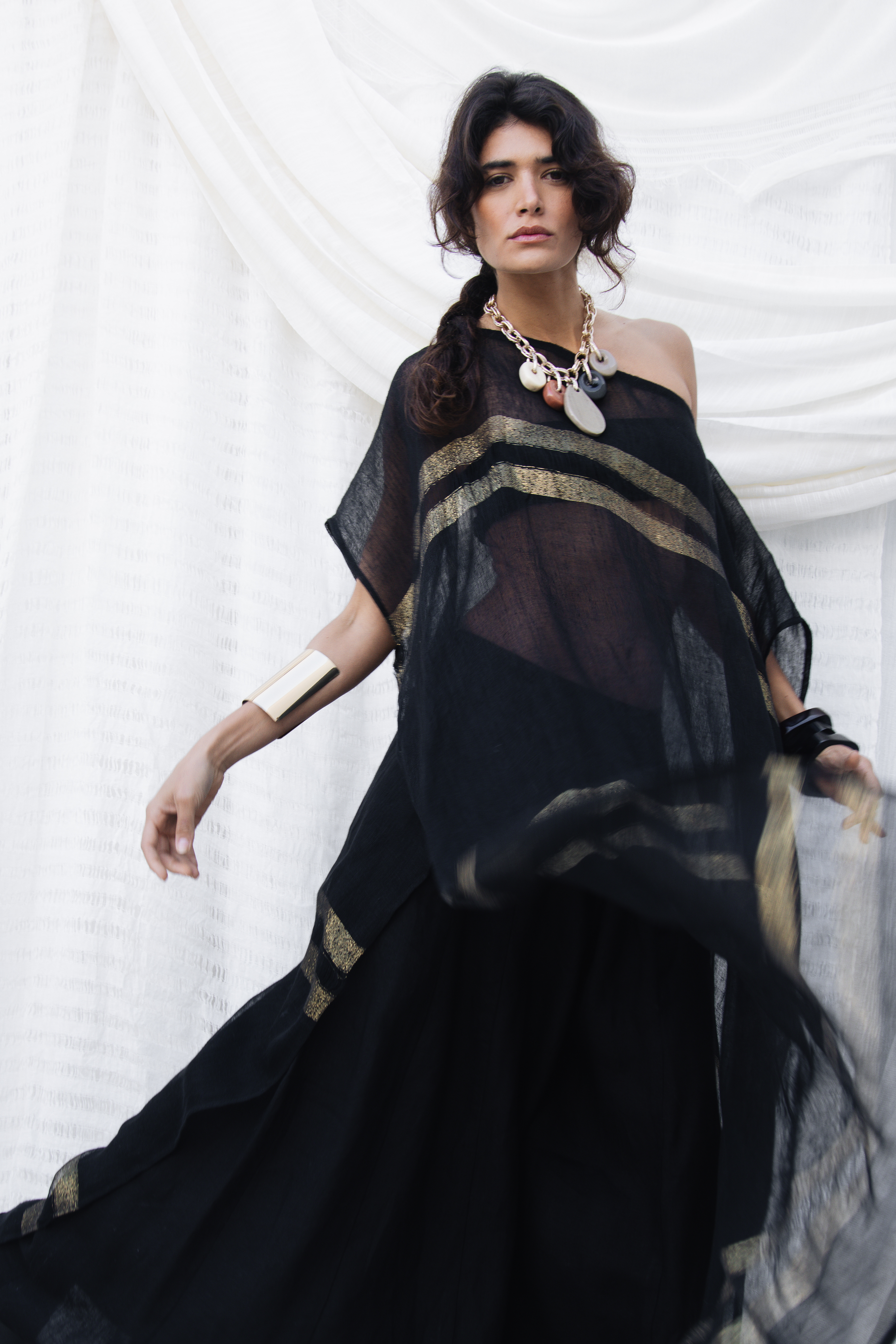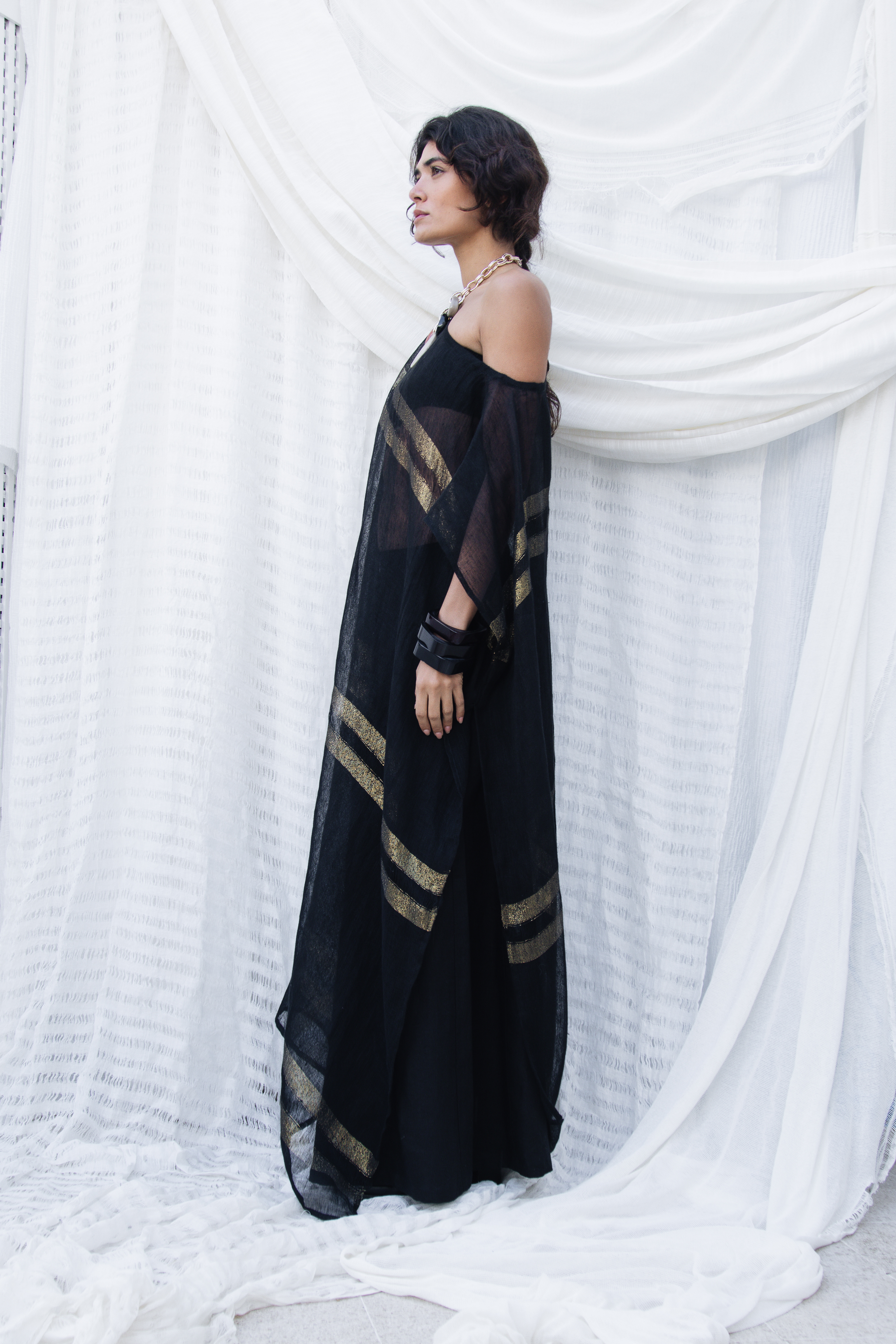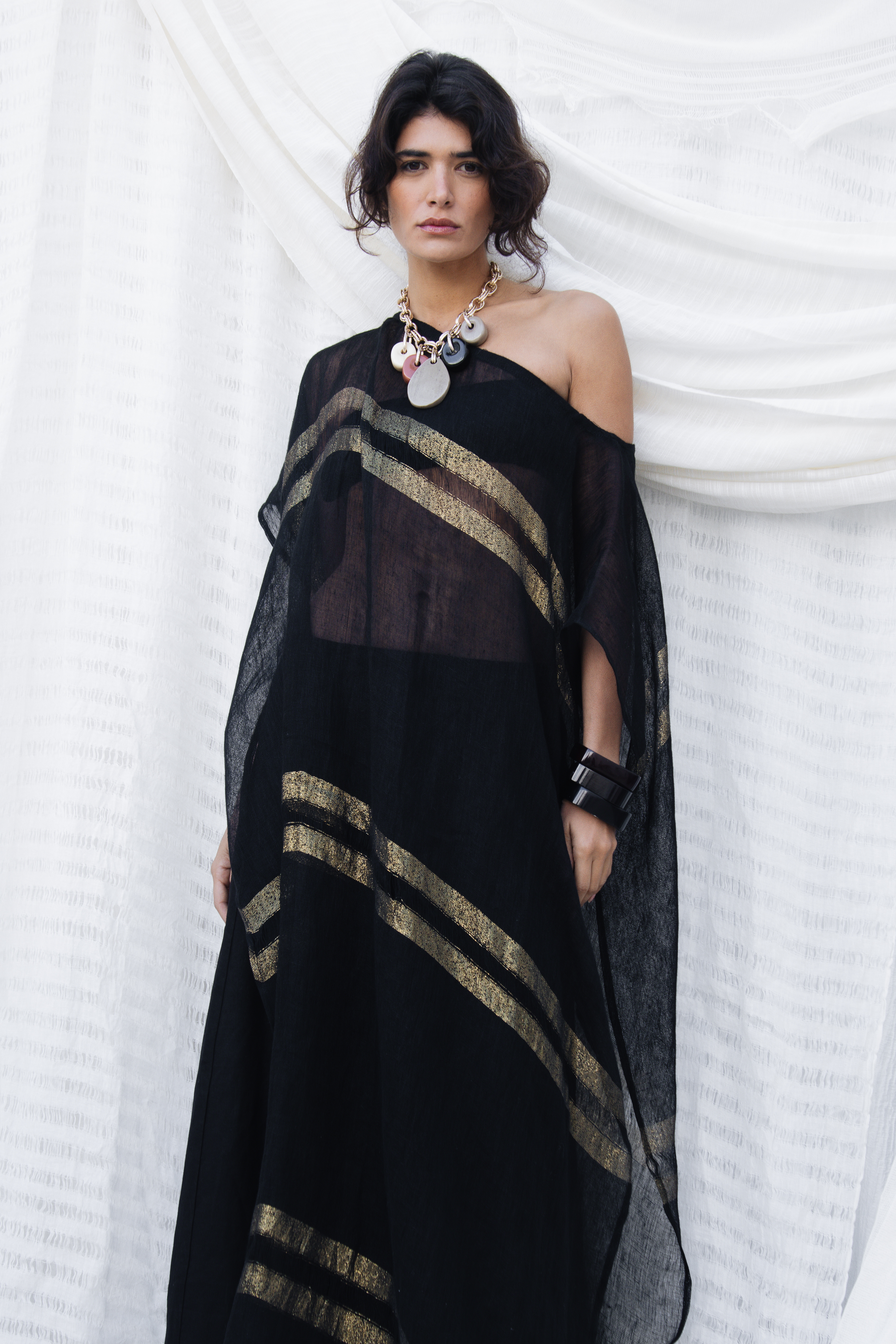 An effortless blend of comfort and elegance, the Athena Kaftan features a relaxed silhouette with flowing lines and refined detailing. Crafted from lightweight, breathable fabric, striped linen gauze with Gold, this timeless piece drapes beautifully and adds a sophisticated touch to any wardrobe. ... Read more Wear it as a Caftan or off the shoulders for a breezy summer look. Perfect for warm days, resort looks or relaxed weekend styling.