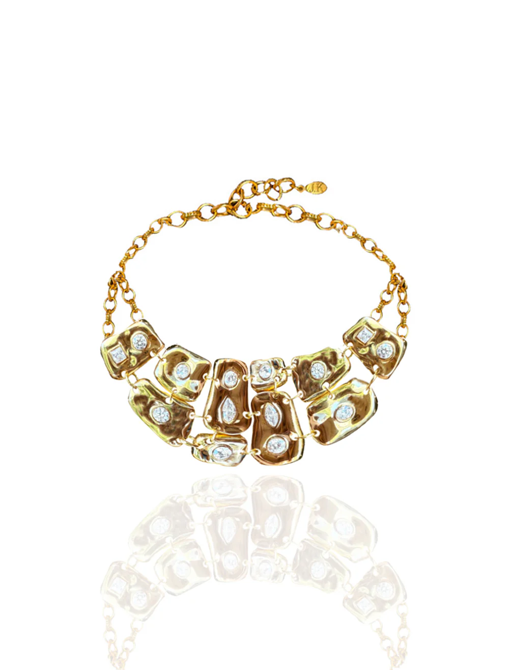 The Auris Bracelet channel modernist elegance with their cascading molten-gold panels. Encrusted with radiant strass, they strike a bold balance between sculptural form and refined sparkle. ... Read more