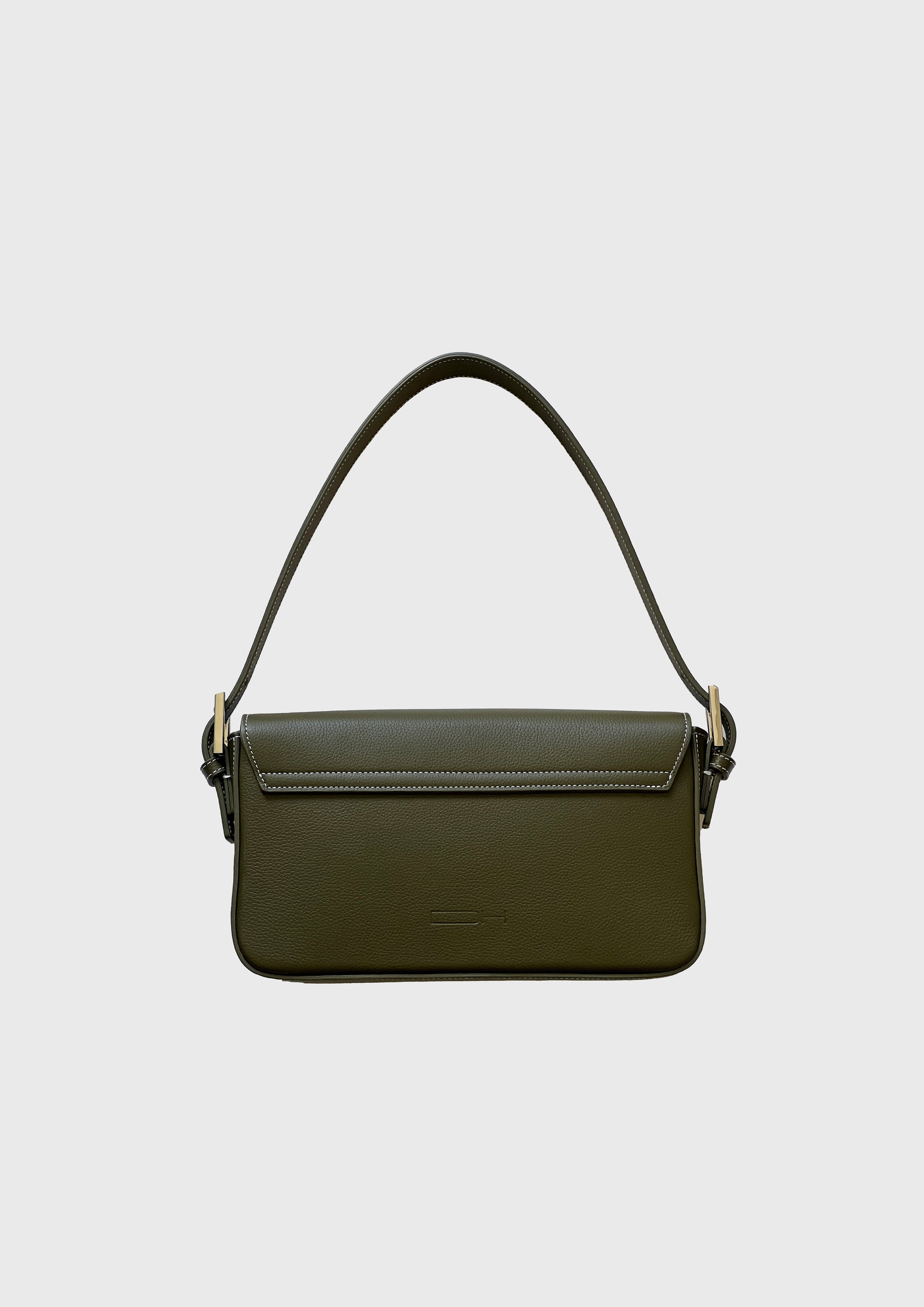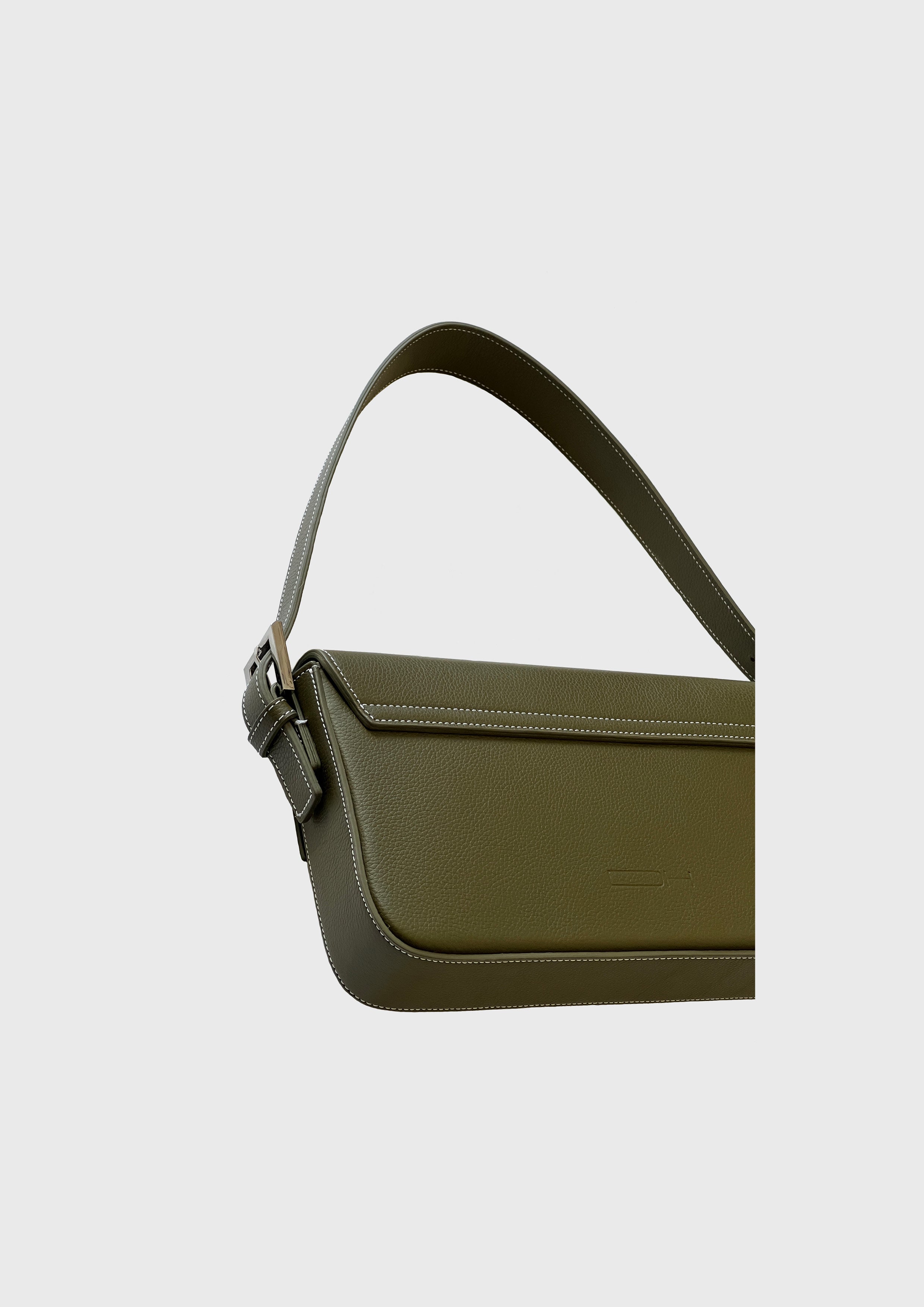 Pebbled calfskin leather shoulder bag in bosco. The bag features an adjustable shoulder strap, fold over flap with a magnetic closure, and interior leather patch logo. On the back of the bag you will find the signature initial branding embossed in the leather. The interior lining is 100% ... Read more cotton-linen in beige. The hardware featured on the bag is silver-toned, for a sleek finish.Height: 15 cm, Width: 28 cm, Depth: 5 cm Shoulder Strap: 60 cmMade in Italy, 100% Grained Calfskin, Lining: 100% Linen.