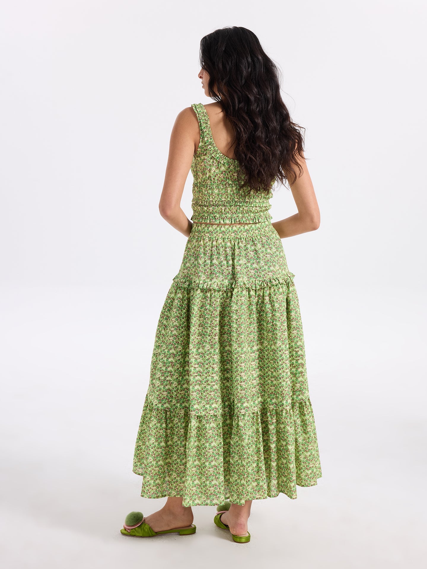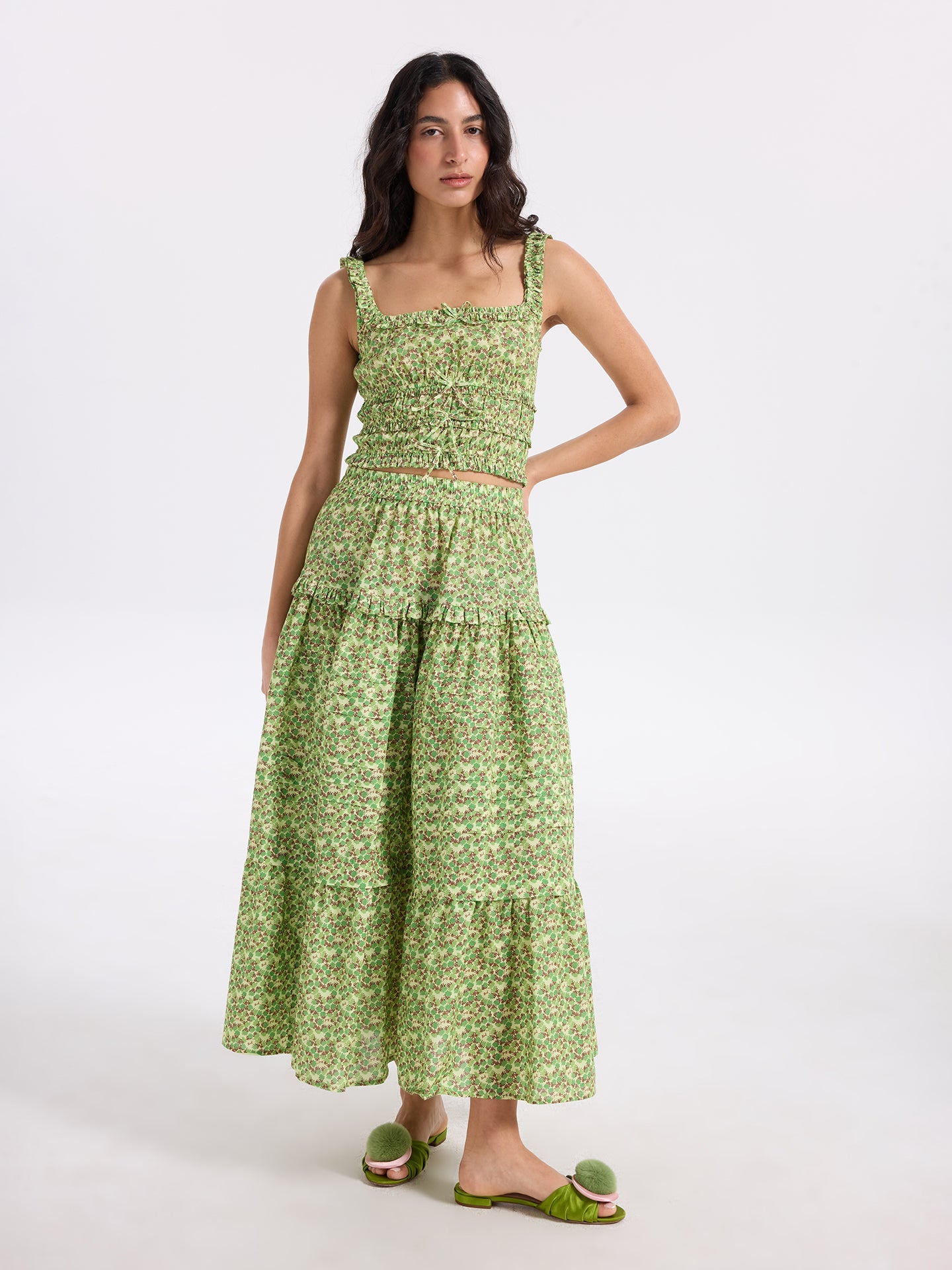 The Bloom Skirt is easy at the waist with soft volume through the skirt. Elastic waistband, pintucks and gentle ruffle tiers give the silhouette its rhythm and shape. Cut in organic cotton voile, it feels airy and breathable — a piece for warm days. This version comes in a green flowers print. ... Read more