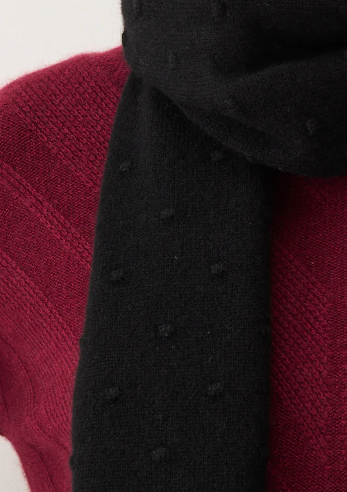 Our modern and playful Bobble Cashmere Scarf in Black brings a joyful touch to winter dressing — the perfect uplift for grey autumn and winter days. Crafted from 100% Inner Mongolian cashmere, it offers unmatched softness and warmth while adding a subtle textured charm through its delicate bobble ... Read more detailing. A timeless staple that pairs effortlessly with any outfit, this scarf is destined to become a firm favourite in your cold-weather collection.