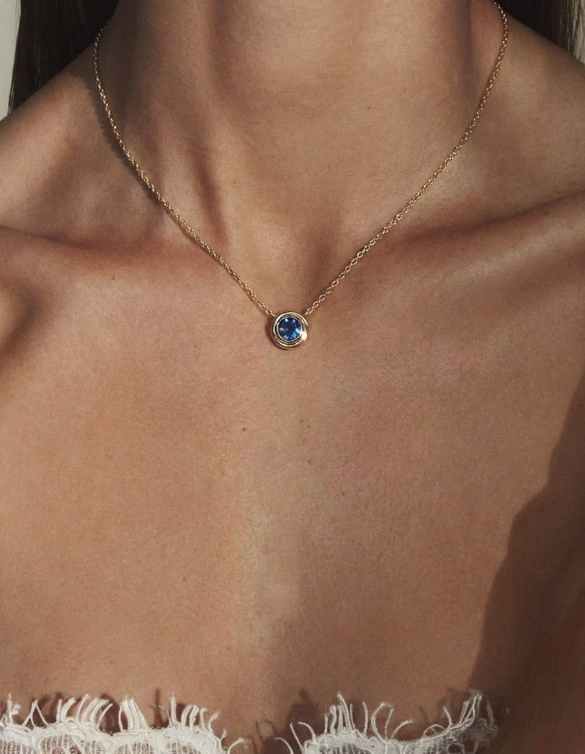 The Current round Sapphire pendant necklace in 18k Yellow Gold is elegant and bold, inspired by the organic shapes formed by water. Handmade in London, the piece is created in one motion embracing the round Sapphire 0.97ct centre.Length: 16-18 Inches ... Read more