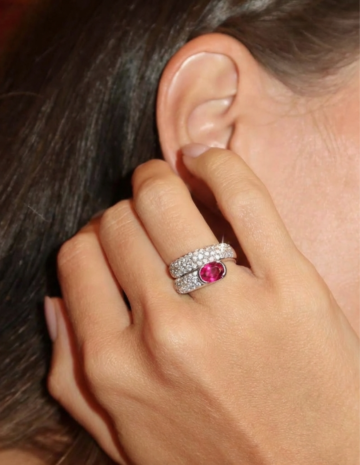 The Cuddle Ring features a Burmese Ruby 1.73ct, known for their unique colouring, it is the finest of all rubies and the ring of gemstones. This contemporary wrap silhouette ring features White Round Diamonds totalling 1.85cts. It is one-of-a-kind and is only available in UK size K1/2 or can be ... Read more resize up to 1 size smaller or larger. Please contact us for resizing request.