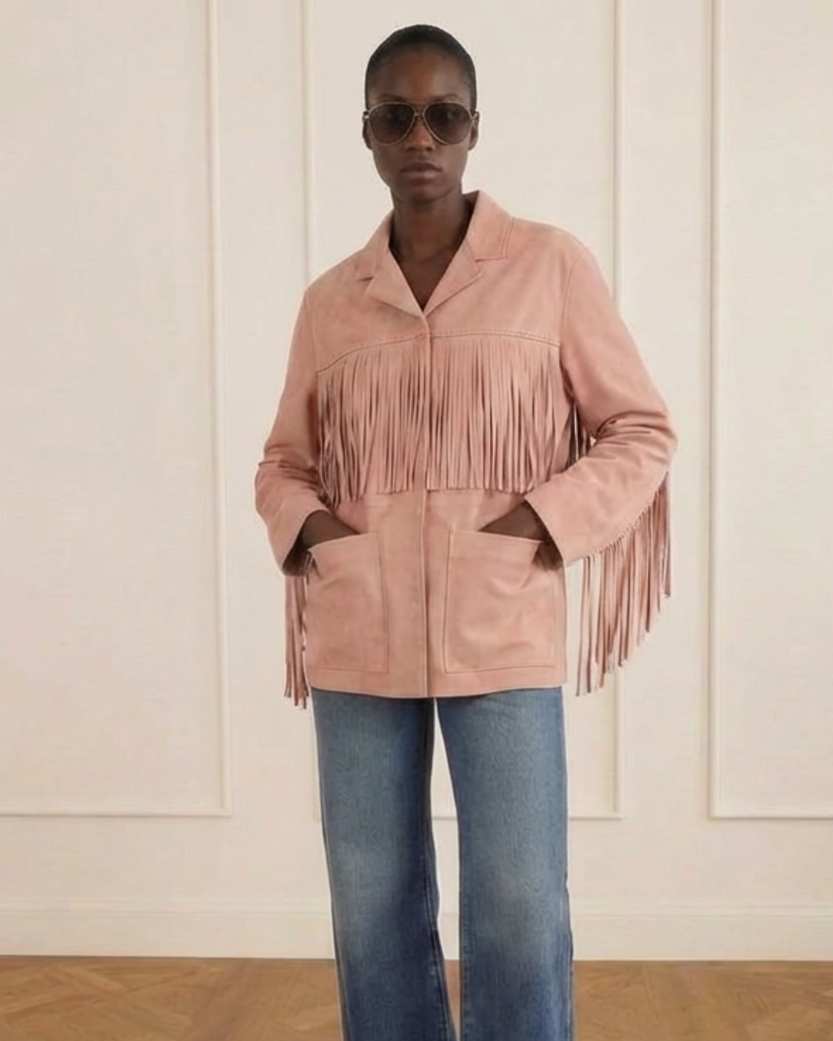 Crafted from luxurious double-sided suede, the Calypso Jacket in Pinkbrings a bold yet refined statement to your wardrobe. Designed with a relaxed silhouette, it features fluid fringe detailing that adds movement and texture, balanced by clean tailoring and patch pockets. The soft pink tone enhances ... Read more its contemporary appeal, making it a standout layering piece that effortlessly blends modern elegance with artisanal character.