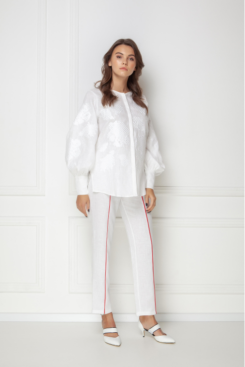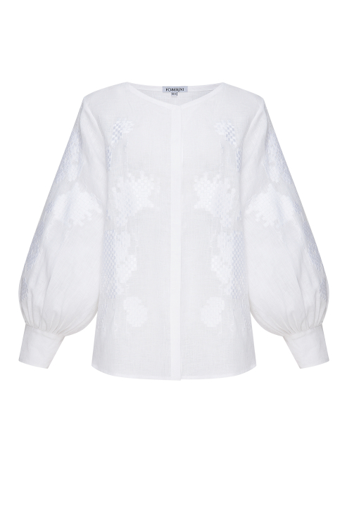 Embroidered with white floral ornament. Button closure in front. High cuffs on the buttons. Exquisite ornament, laconic cut and feminine silhouette make this bohemian blouse an ideal element of a gala look. ... Read more
