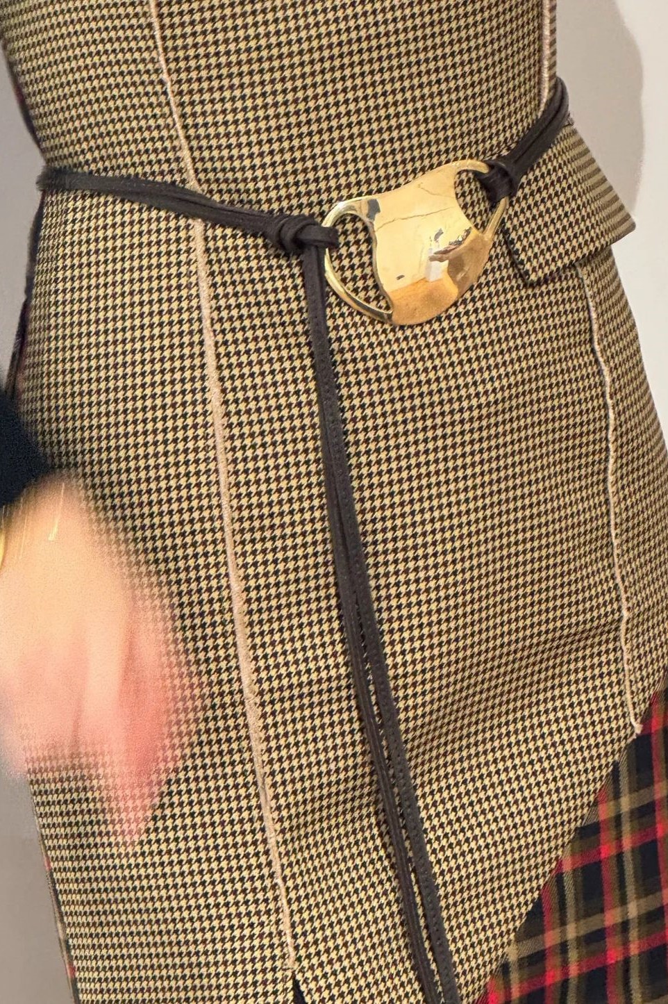 An effortless statement. A sculptural gold-tone abstract buckle intertwines with a 2m dark brown calf leather strap, stitched with precision and matching thread for a modern edge. Versatile by design, can be worn with jeans, tailored trousers, or over a dress. ... Read more