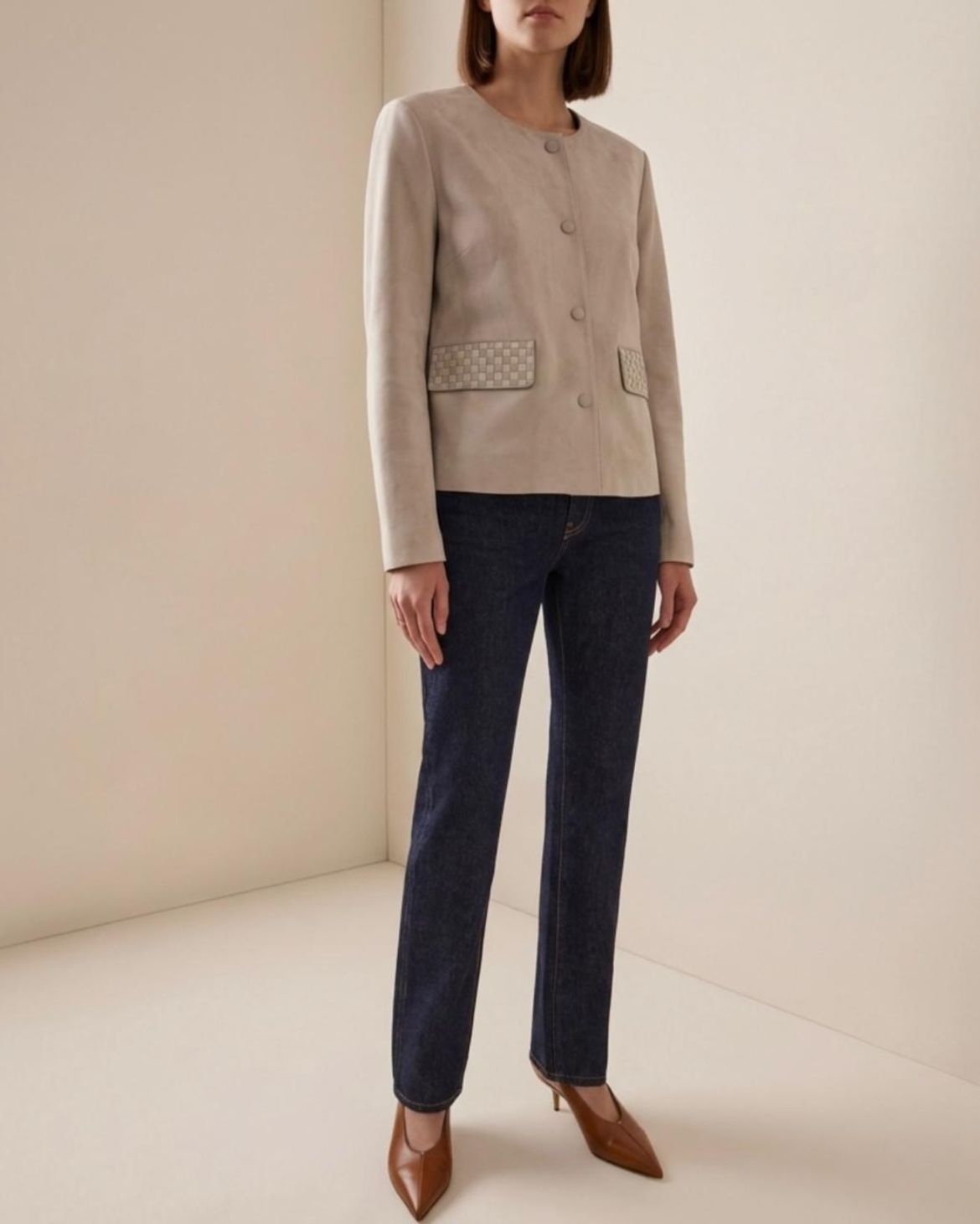 Made from high-quality double-faced suede for a refined finish, the Canto Jacket in Safari offers a refined blend of softness and structure. Designed with a clean, minimalist silhouette, it features a round neckline, subtle button fastening, and textured pocket detailing for a modern finish. The ... Read more cool green tone adds a fresh, contemporary edge, making it an effortlessly elegant piece for both day and evening styling.