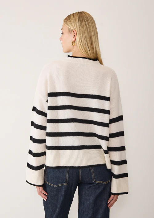 Nothing is cooler or easier to wear than monochrome stripes. Knitted in a heavier weight for colder days this sweater is cosy and generously proportioned. With cardigan ribbed trims and a wide slightly high neck for a flattering sweater that you'll reach for time and again. Crafted from 100% ... Read more sustainable recycled cashmere.
