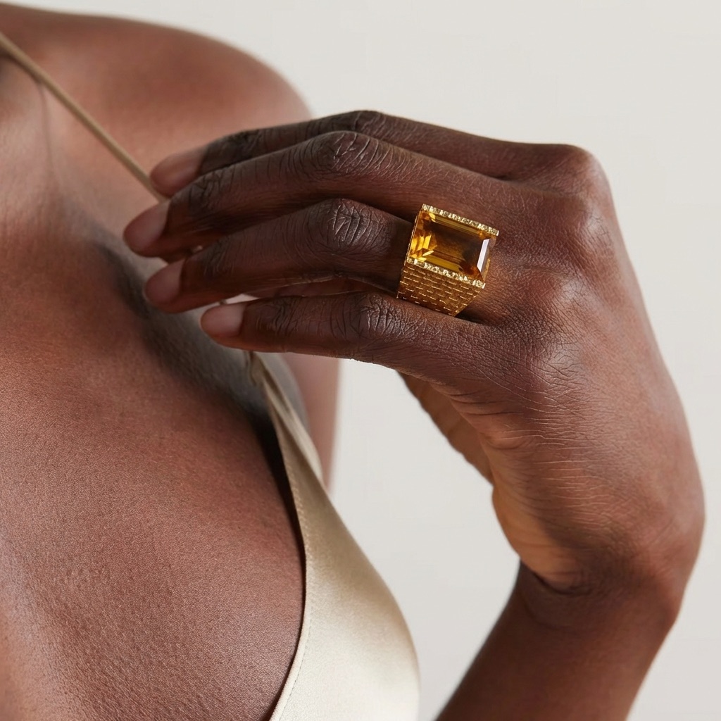 Make a striking statement with this beautifully crafted ring featuring a chiselled rectangular citrine stone set in a refined gold-toned band. The unique geometric silhouette and rich hue of the citrine bring modern elegance and organic charm together, creating a standout piece that effortlessly ... Read more enhances both everyday styles and elevated looks. Perfect for those who appreciate bold design with timeless sophistication.