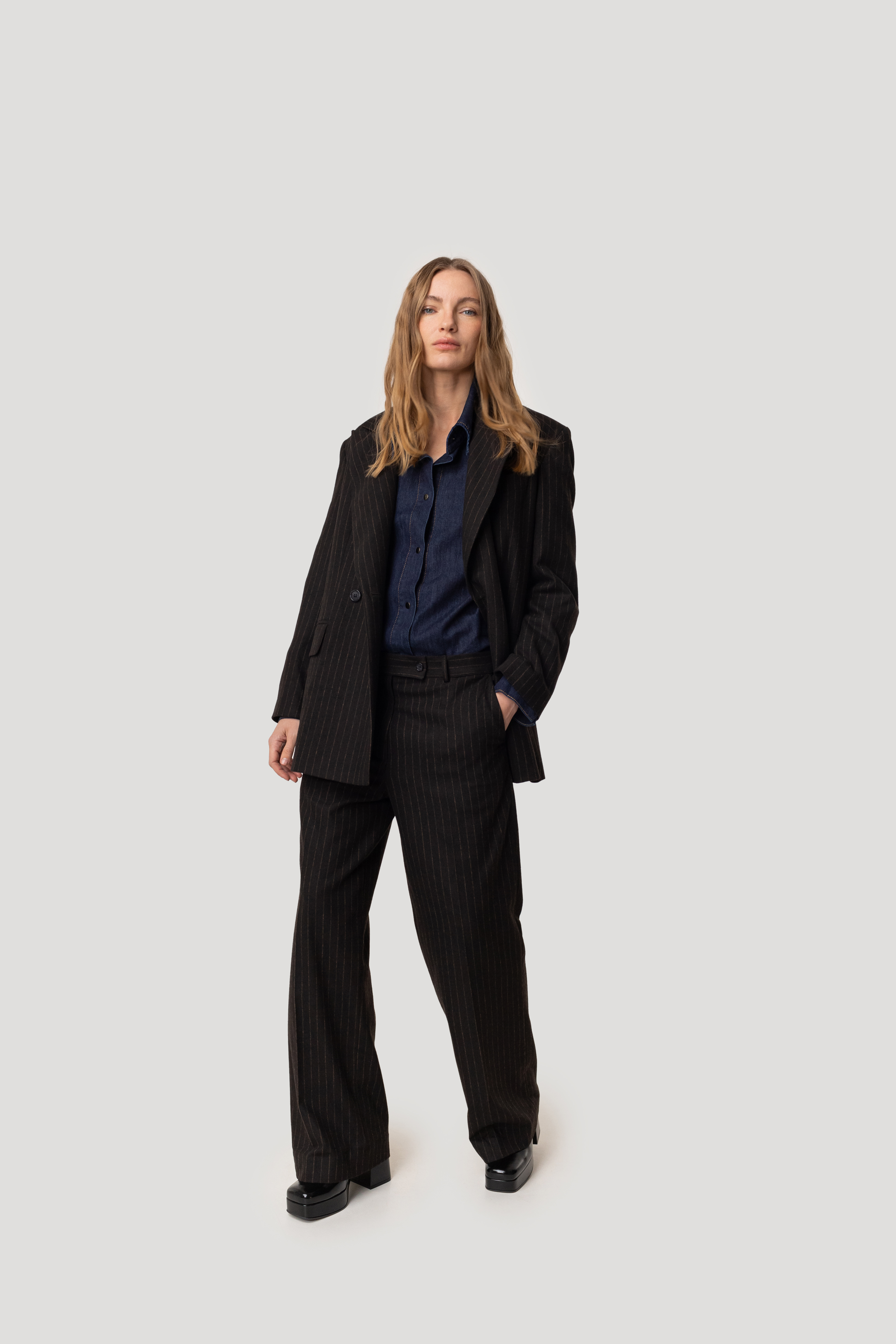 Pinstripe multisize relaxed-fit trousers crafted from luxurious wool-blend flannel with our signature ComfyStretch system. The waistband adjusts seamlessly to your natural body variations, offering a personalised, tailored fit without compromising on aesthetic purity. Handmade with meticulous ... Read more attention to detail, these trousers combine refined structure with effortless comfort. The relaxed wide-leg silhouette drapes beautifully, making them equally suited for everyday dressing or elevated occasions. A versatile wardrobe staple designed to move with you and maintain an impeccable look throughout the day.