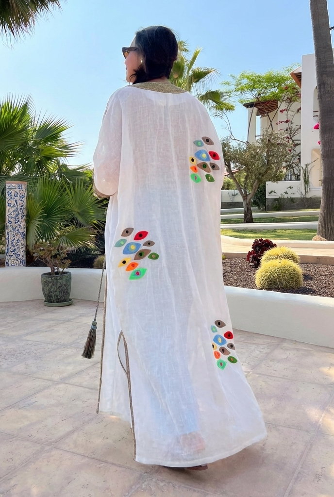 This white linen kaftan by Artwear Gallery is a celebration of craftsmanship and effortless elegance. Delicately hand-embroidered with vibrant, eye-like motifs scattered across the back and hem, each detail reflects the brand’s artistic storytelling and dedication to traditional techniques. No two ... Read more pieces are exactly alike, with every embroidery thoughtfully hand-stitched by local artisan.