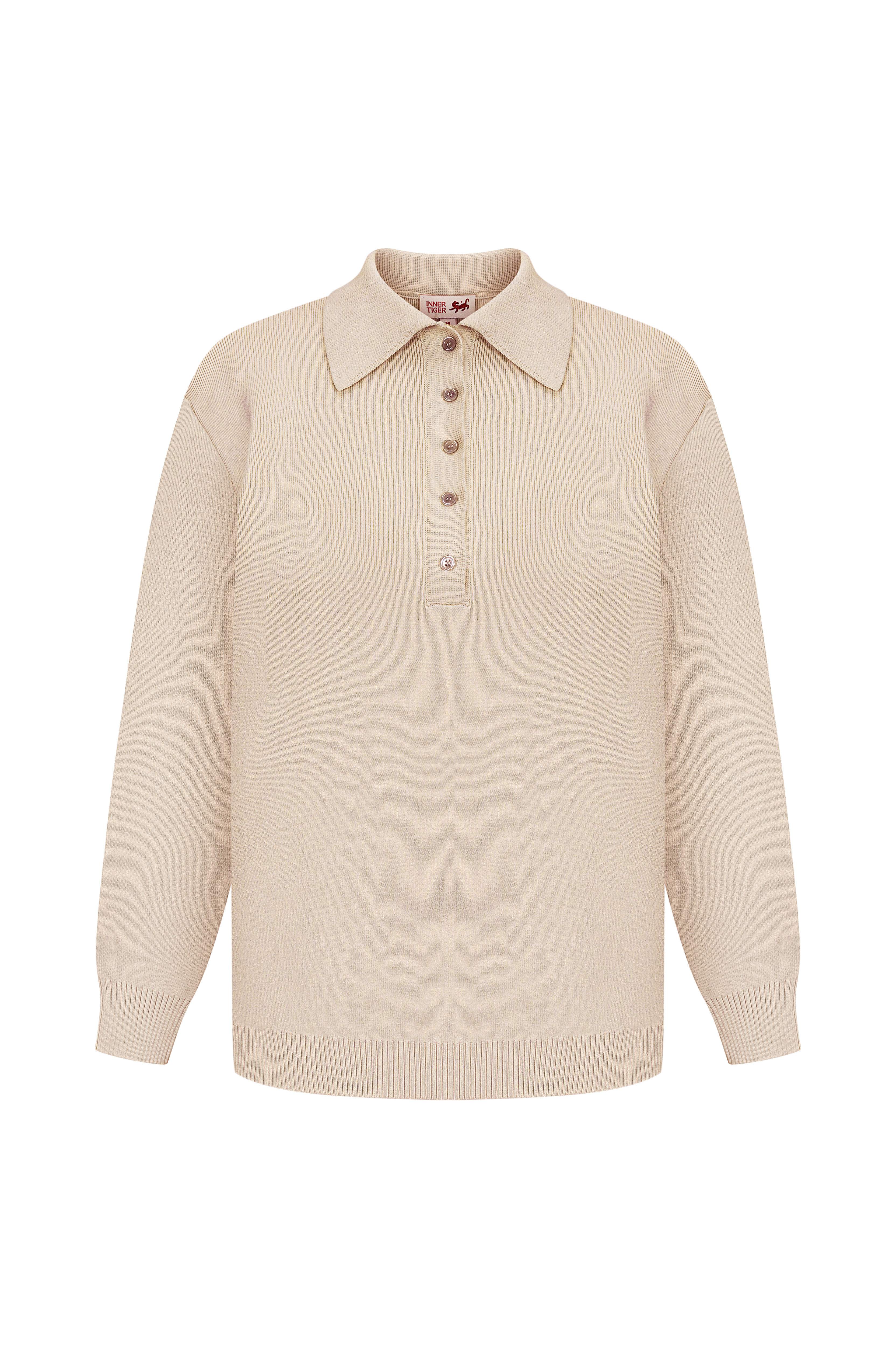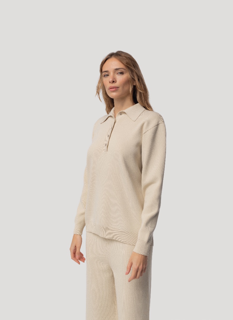 This luxurious knitted polo shirt is crafted from a soft viscose blend, offering gentle warmth, natural breathability and a comfortable, flexible fit. Designed with a wide, refined collar and finished with elegant mother-of-pearl buttons, it brings a polished touch to any look. The smooth, ... Read more lightweight knit makes it ideal for layering or wearing on its own — a versatile, elevated essential for every season.