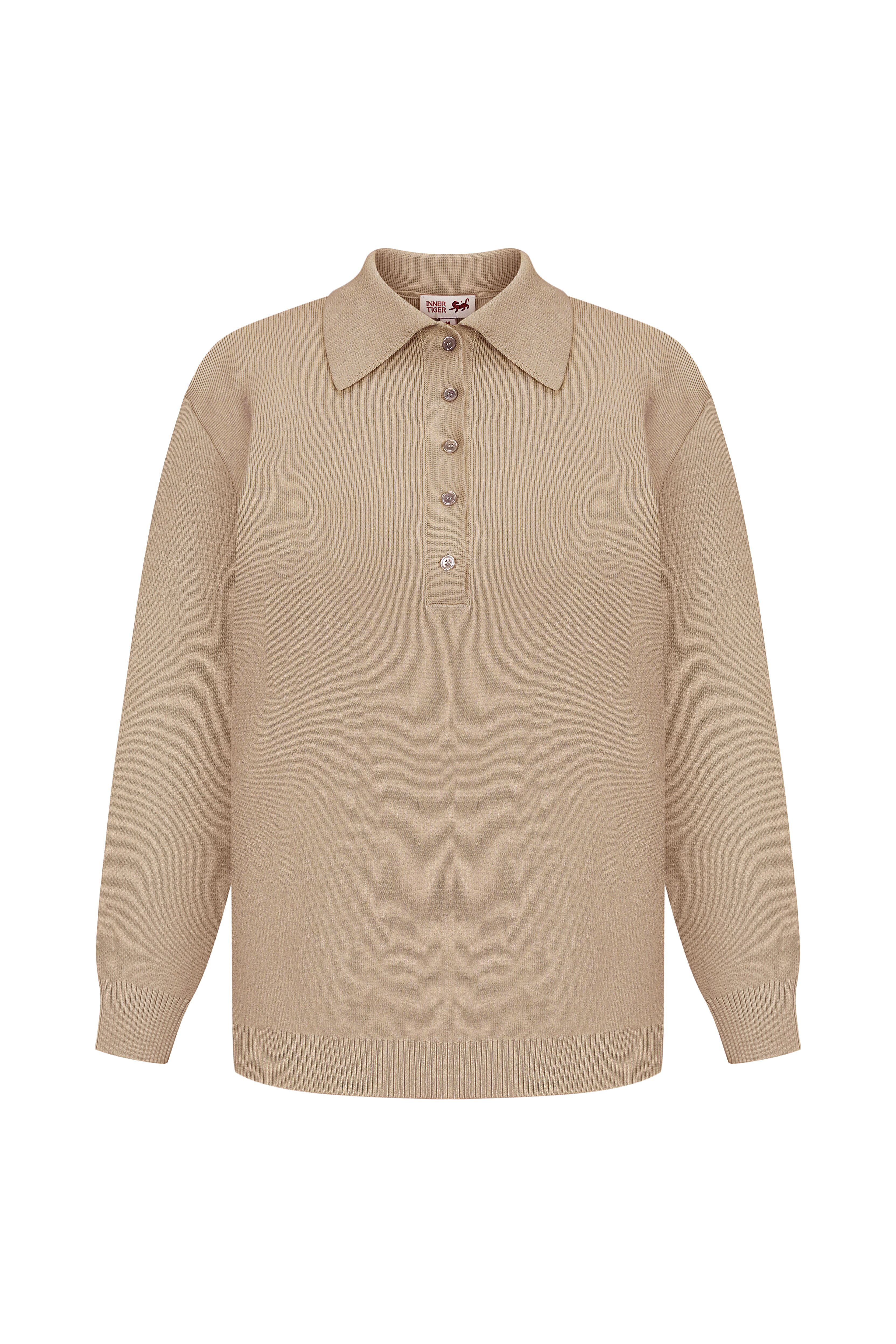 This luxurious knitted polo shirt is crafted from a soft viscose blend, offering gentle warmth, natural stretch and exceptional comfort. The wide, refined collar and elegant mother-of-pearl buttons add a sophisticated touch, elevating a classic silhouette into a polished wardrobe essential. ... Read more Lightweight, breathable and smooth against the skin, it works perfectly for layering or wearing on its own — a versatile piece made to move effortlessly through the seasons.