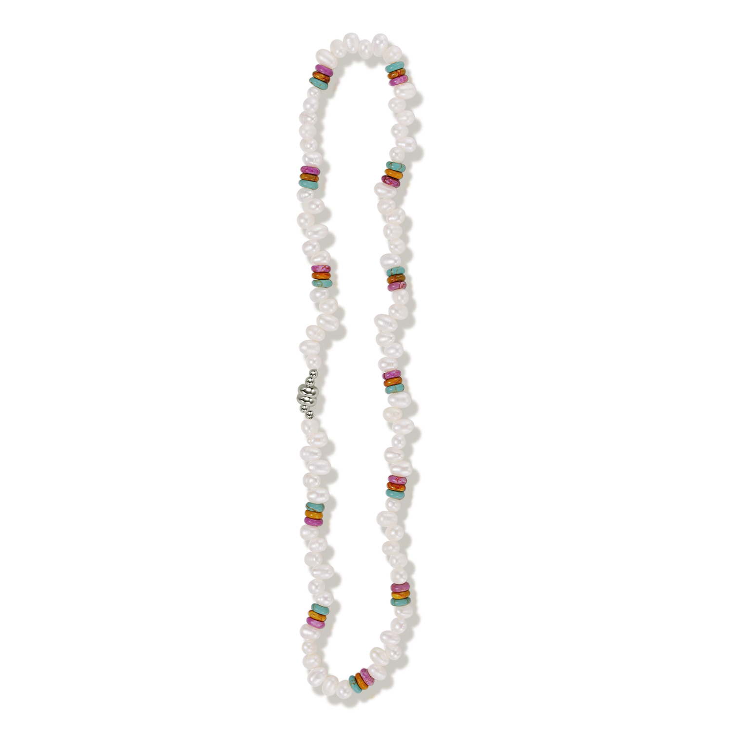 This necklace blends timeless elegance with playful charm, featuring lustrous freshwater pearls accented by vibrant multicolored beads. The natural irregularity of the pearls gives it a unique, organic feel, while the bold pops of color add a modern, youthful twist. Perfect for layering or wearing ... Read more as a standalone statement, this piece transitions effortlessly from casual daytime looks to elevated evening style, making it a versatile and eye-catching addition to any jewelry collection.