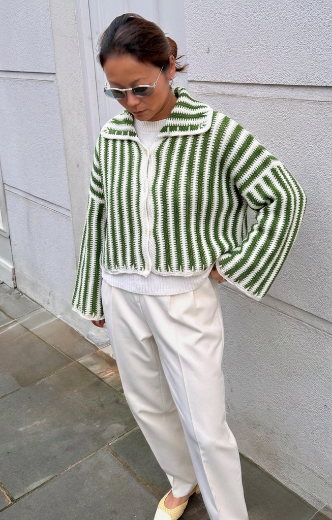The Daria Jacket is a beautifully hand-knitted piece, crafted by local artisans from cotton and highlighted with subtle silk threads for a gentle, luminous finish. Rendered in layered shades of green and soft white, the design features bold, graphic patterning that creates contrast and depth while ... Read more maintaining an understated, earthy elegance. Designed with a relaxed silhouette, long sleeves, and a clean front opening, the jacket balances comfort with structure.