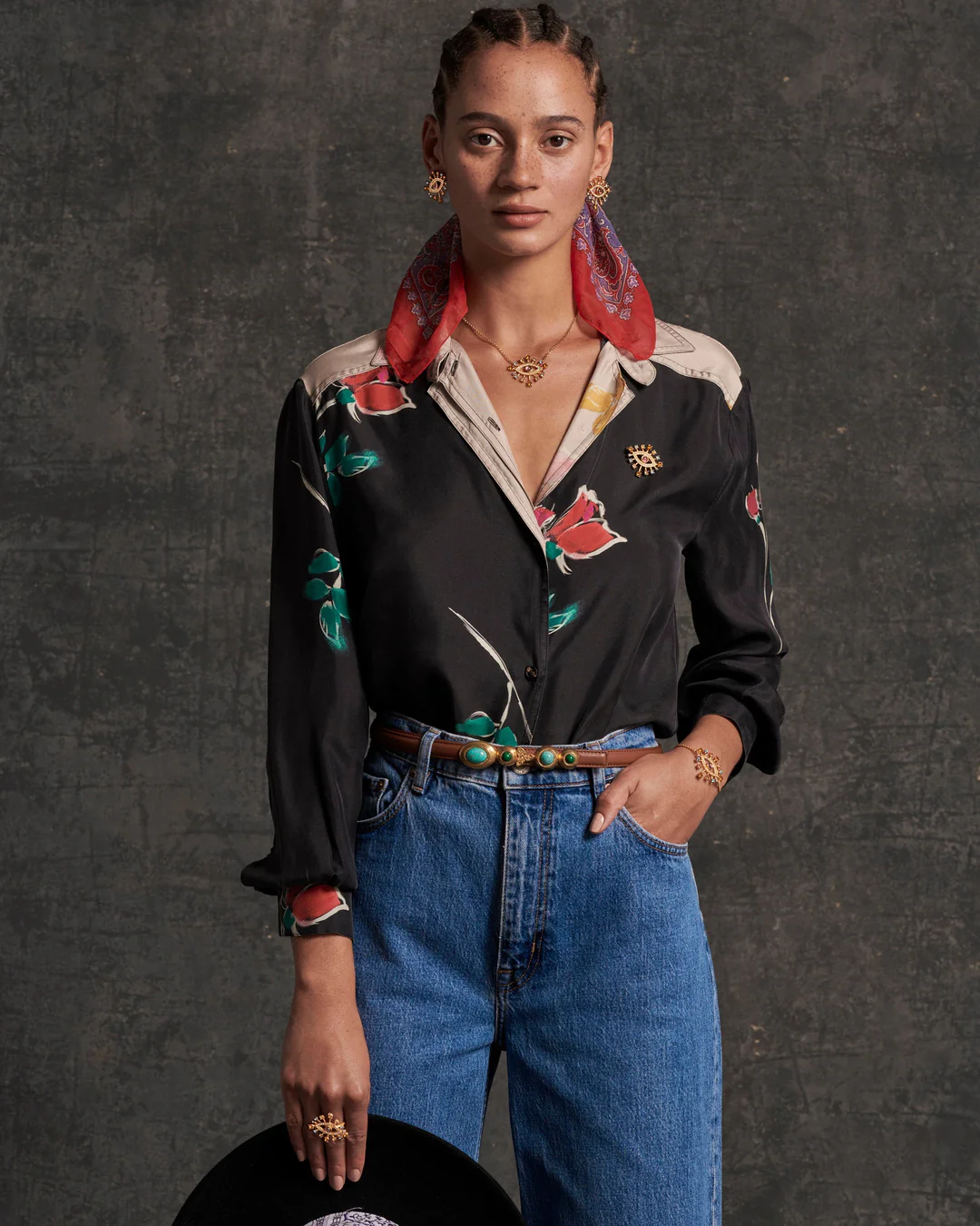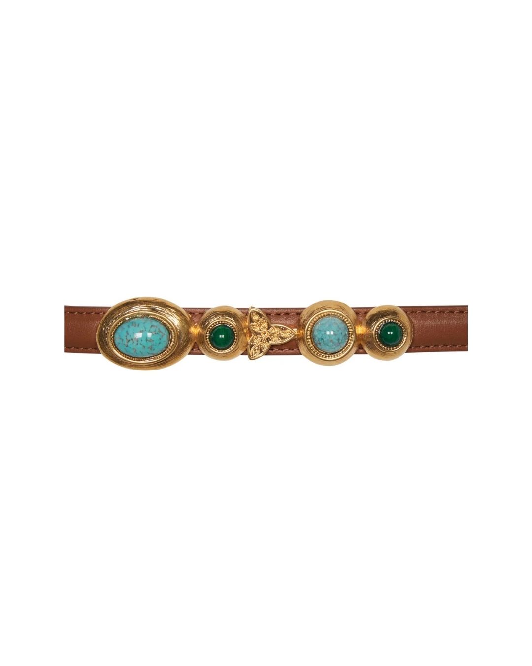 Enhance your ensemble with this narrow brown leather belt from our Earth capsule. Adorned, at its front, with a collection of turquoise and malachite coloured stones set within spherical golden borders, it celebrates the captivating essence of the natural world. ... Read more