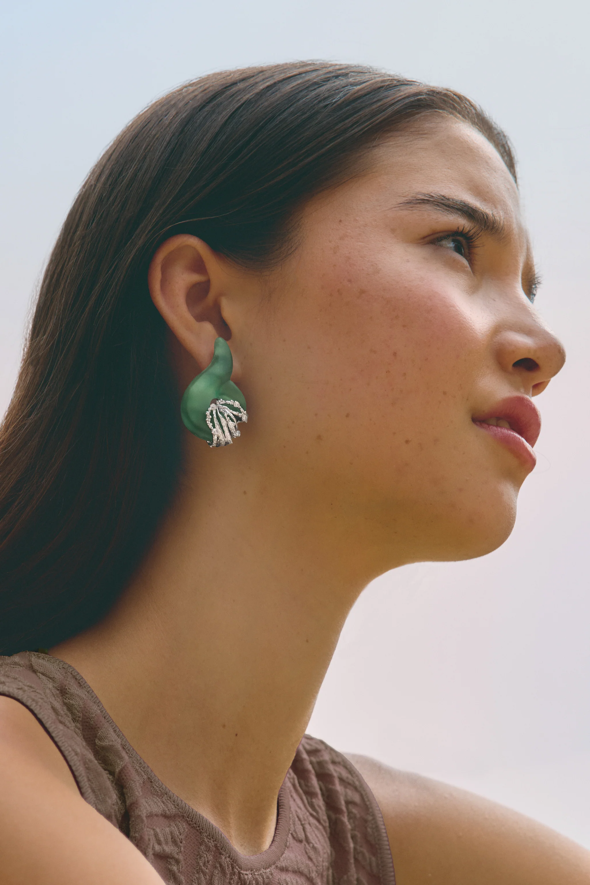 Illuminate your look with these captivating Essence Earrings - an artful blend of organic resin and sculptural metal, designed to celebrate your inner light. The circular resin form symbolizes the path we take in life, always winding back to our core, and is hand-polished to a soft, inner glow that ... Read more seems to emanate from within. Surrounding it, the metal cage keeps your essence protected and beautifully concealed, its sculpted granulated metal bars subtly set with brilliant crystal stones that catch the light with every turn. These earrings are a luminous reminder that no matter where life leads, you always return to your true self - your essence.