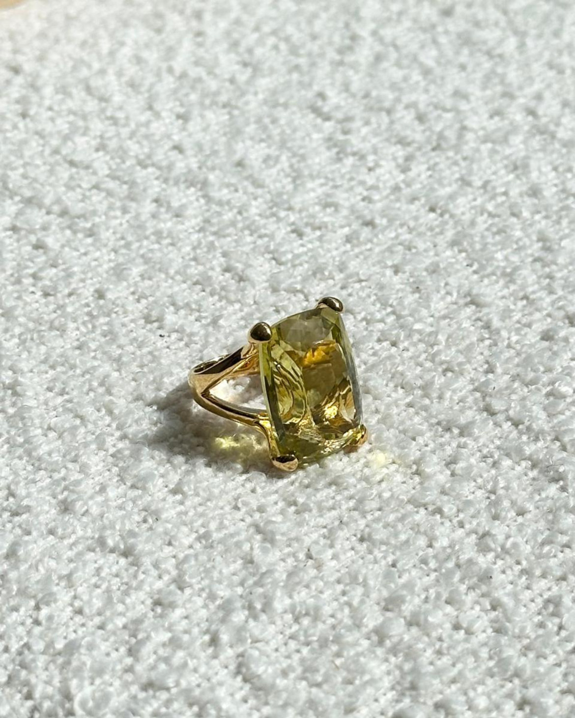A statement in its purest form, this cocktail ring features a radiant faceted cushion-cut lemon quartz that catches the light with every movement. Set in a sleek gold-toned band, the soft citrus hue brings a fresh, luminous touch — bold yet effortlessly refined. Designed to stand out while remaining ... Read more timeless, it’s the kind of piece that elevates both everyday looks and occasion dressing with quiet confidence.