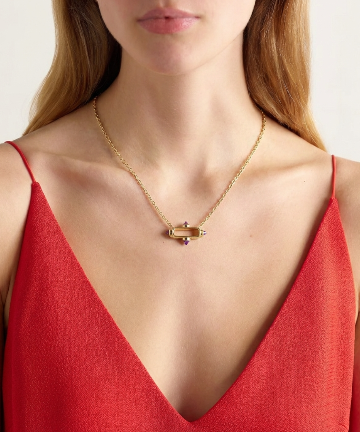 Featuring 15x15mm gold oval links, the necklace is adorned with four vibrant purple amethyst gemstones, known for their rich, regal hue. The contrast between the warm gold and the striking purple stones creates a harmonious and luxurious aesthetic. Perfect for both everyday wear and special ... Read more occasions, this necklace adds a pop of color and timeless charm to any outfit. A true statement piece for the modern jewelry lover.Gold Oval link: 15 x 15mm link with lobster clasp; Length 15mm, Width: 5mm thickness, Height: 5mm. Set in with our natural 4mm Purple Amethyst, in reverse diamond cut.Please note: All orders after 16th December will be shipped after 7th January.