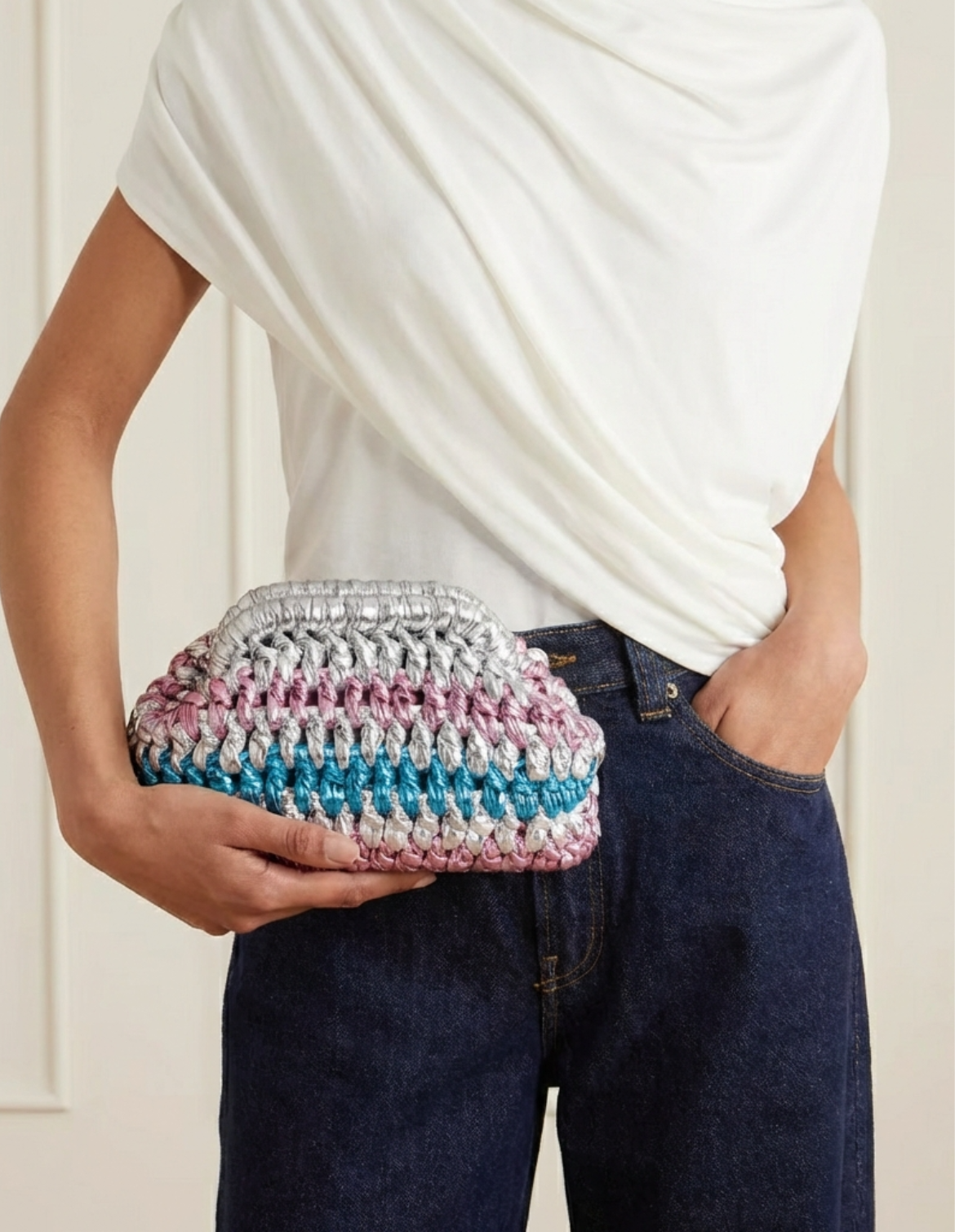 Introducing the latest addition to Deino's stunning collection: the Ice Ice Baby bag. This eye-catching accessory features a sleek silver base adorned with intricate pink and blue woven details, creating a unique and stylish design that is sure to turn heads. Crafted from high-quality materials, ... Read more this bag is made from 100% polypropylene with faux leather accents, combining durability with a touch of luxury. The spacious interior offers plenty of room for all your essentials, making it the perfect companion for any outing.