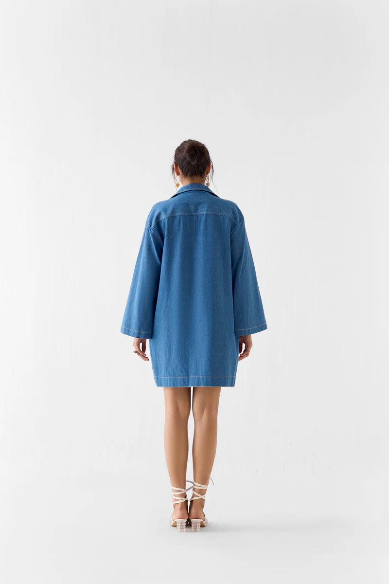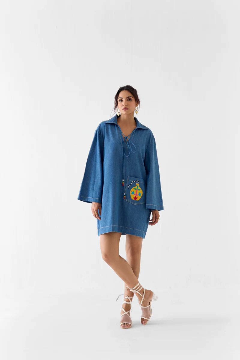 The Indigo Short Dress crafted from our 100% denim fabrication, trans-seasonal, is a statement piece. The shirt, made in our soft faded indigo denim, reflects fine artisanal craftsmanship, has a boxy fit. With knots on the collar, the dress has lace & bead detail. Featuring a summery look, it ... Read more has been hand embroidered with patchwork pottery made with fabric in pop colours. Wear it with heels for an elegant look. Details: The model is wearing a Size M.