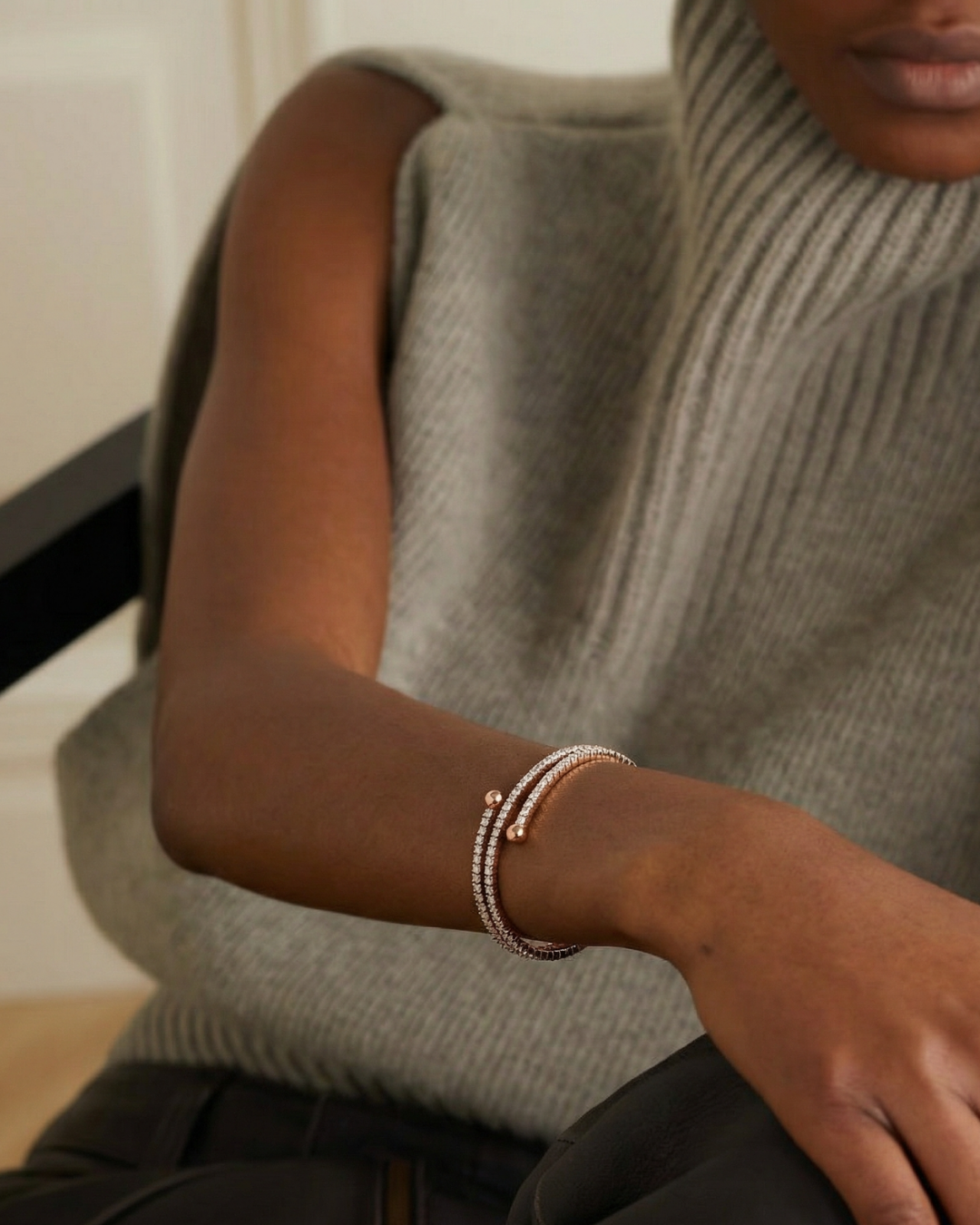 Light, luminous and powerful. Designed to effortlessly and delicately embrace your wrist, it will add a luminescent sparkle which enhances that inner light in you. Perfect to be worn on its own or layered with all your favourite bangles, this piece will surely stand out.925 Oxidised Silver ... Read more Double Row Zircon & Natural Stones