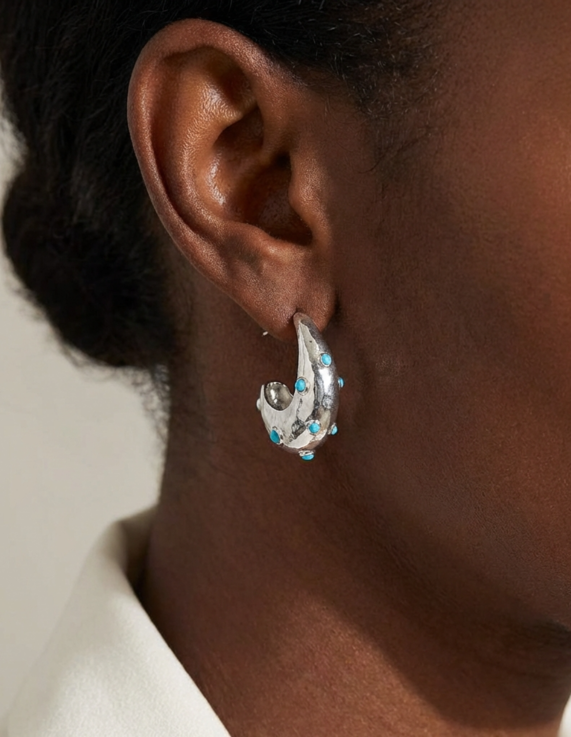Introducing the epitome of elegance and sophistication - the Inoui Silver/Turquoise earrings from Jessica K. These exquisite earrings are crafted from high-quality metals, ensuring durability and a luxurious finish that will last for years to come. Featuring a unique curved design adorned with ... Read more delicate turquoise dots, these earrings exude timeless charm and subtle glamour. The silver finish adds a touch of sparkle and sophistication, making them the perfect accessory for any occasion.