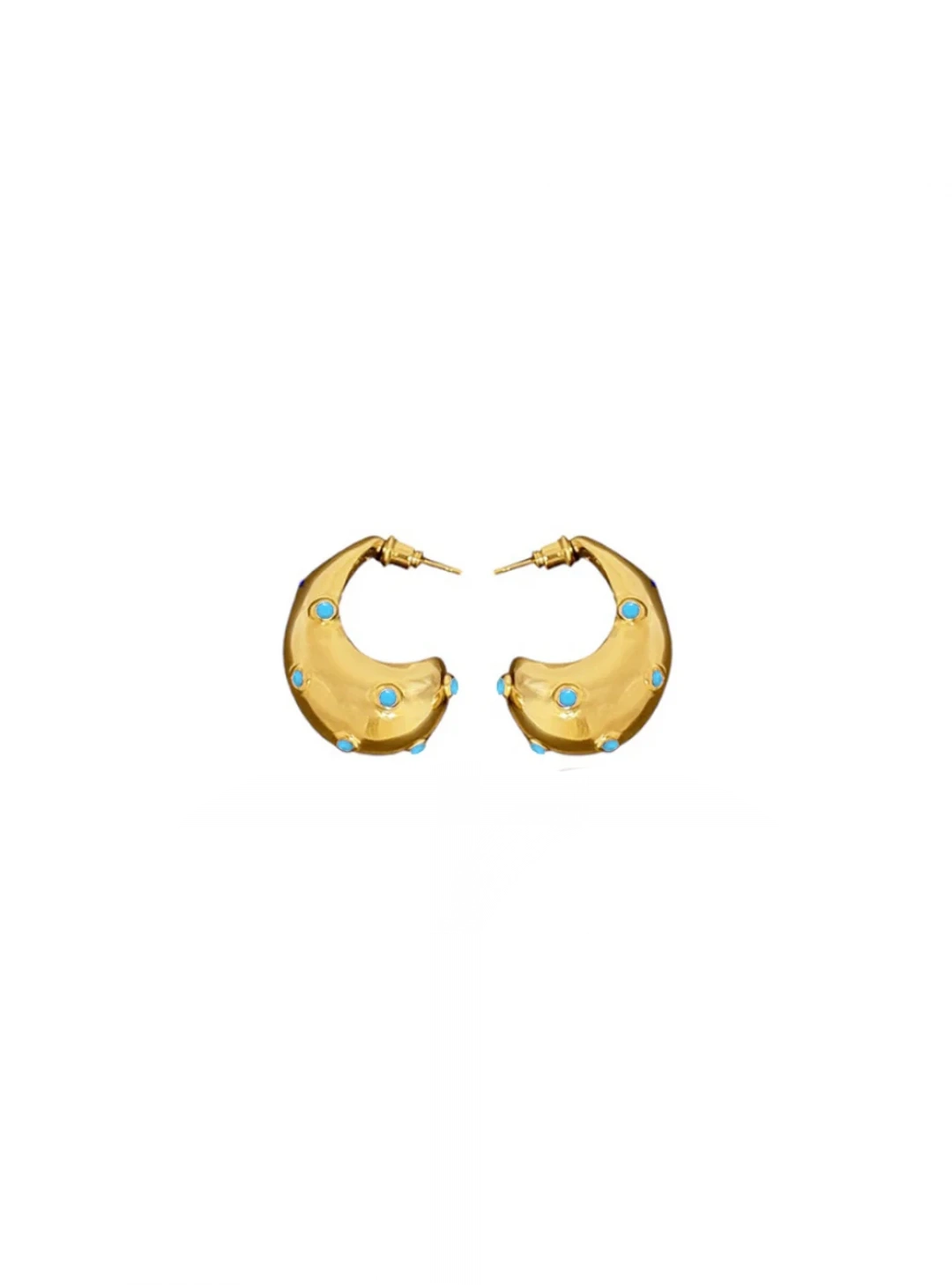 Introducing the exquisite B.O Inoui Turquoise Earrings from Jessica K, where elegance meets sophistication. Crafted from high-quality metals, these stunning earrings feature a curved design adorned with gold accents and delicate turquoise dots. The intricate detailing and unique design make these ... Read more earrings a standout accessory, perfect for adding a touch of glamour to any outfit. Whether you're dressing up for a special occasion or adding a hint of luxury to your everyday look, the B.O Inoui Turquoise Earrings are sure to turn heads and make a statement.