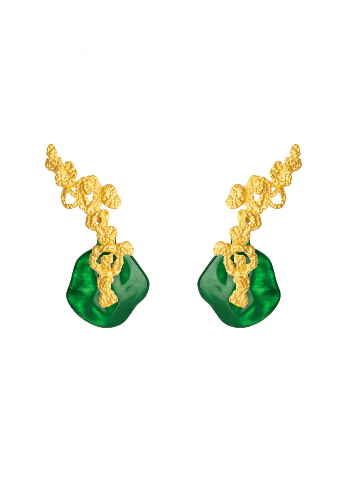 A string of clustered and pebbled gold-plated brass that bend with the lobe and past the ear, ending in a custom-dyed removeable resin disc. The interchangeable Erosion Earrings in Dark Green tell a tale of nature's sculptor, and sing a ballad of smooth and rough. ... Read more