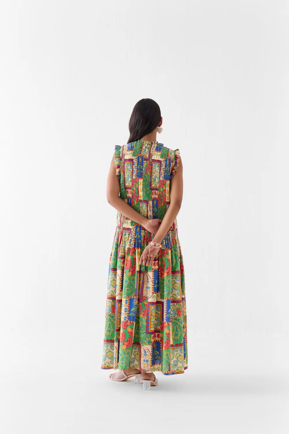 The Johari Ruching Dress crafted from our 100% cotton fabrication, trans-seasonal, is a statement piece. The dress, made in our hand drawn Johari patchwork print with all over paisleys, reflects fine artisanal craftsmanship. It is full length. With ruching all the way till the waist, this dress has ... Read more cap sleeves and gathers. Featuring a summery look, it has a straight fit. Wear it with strappy heels for an elegant look. DETAILS: The model is wearing a Size S.