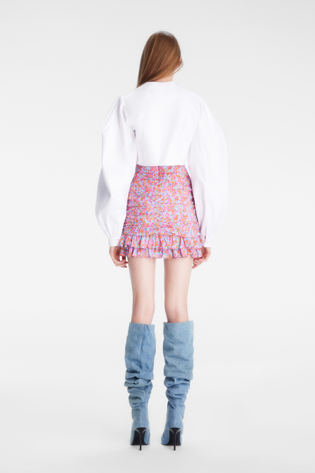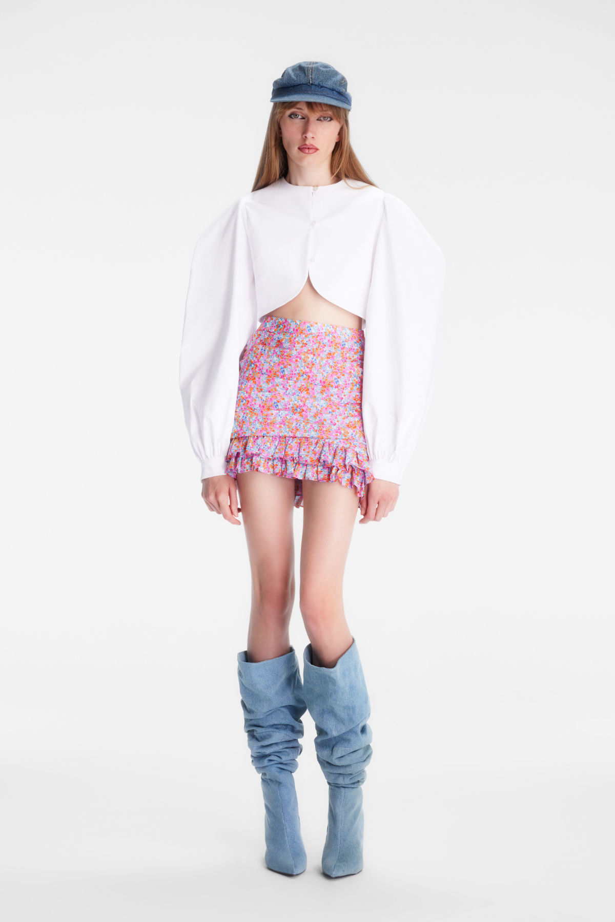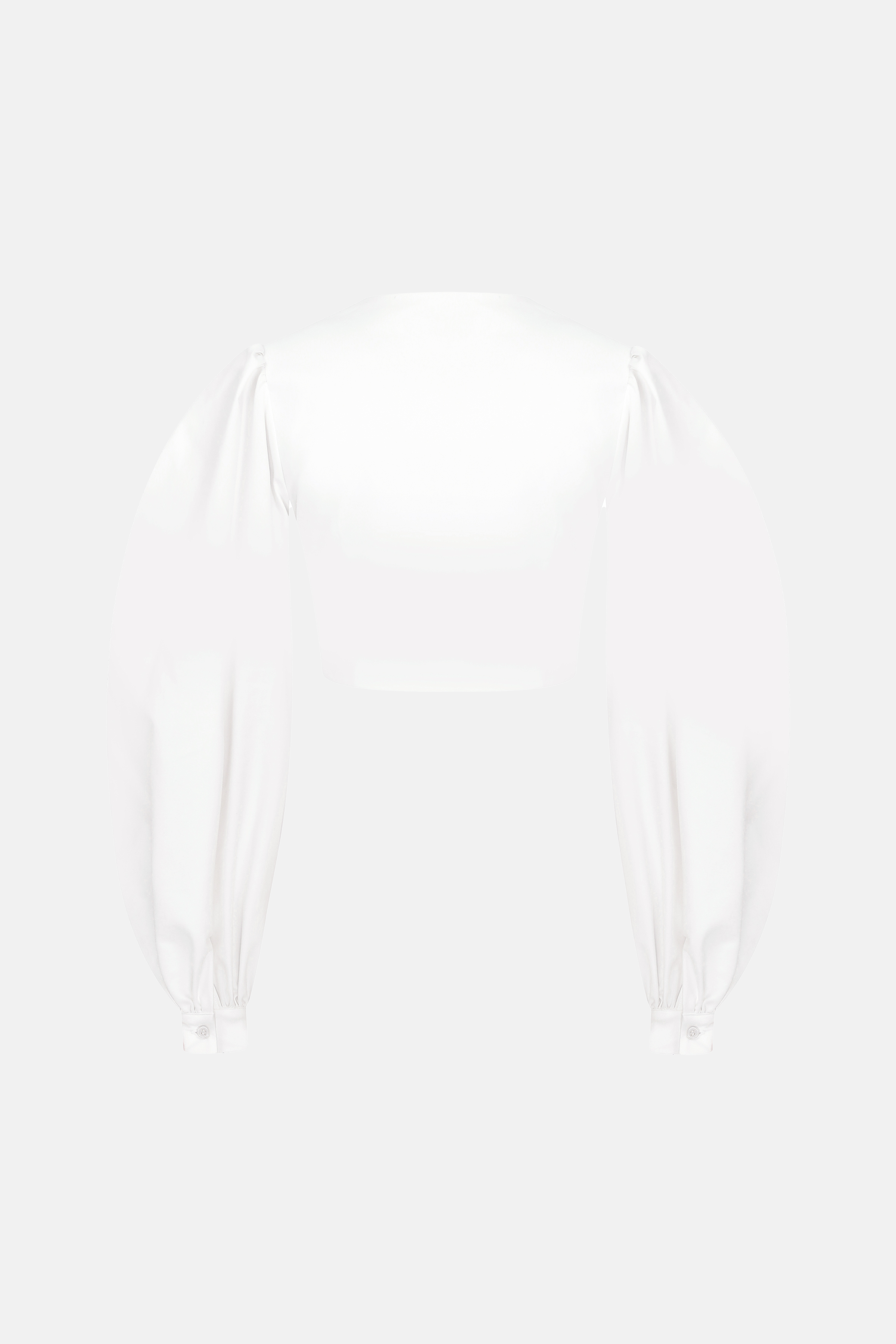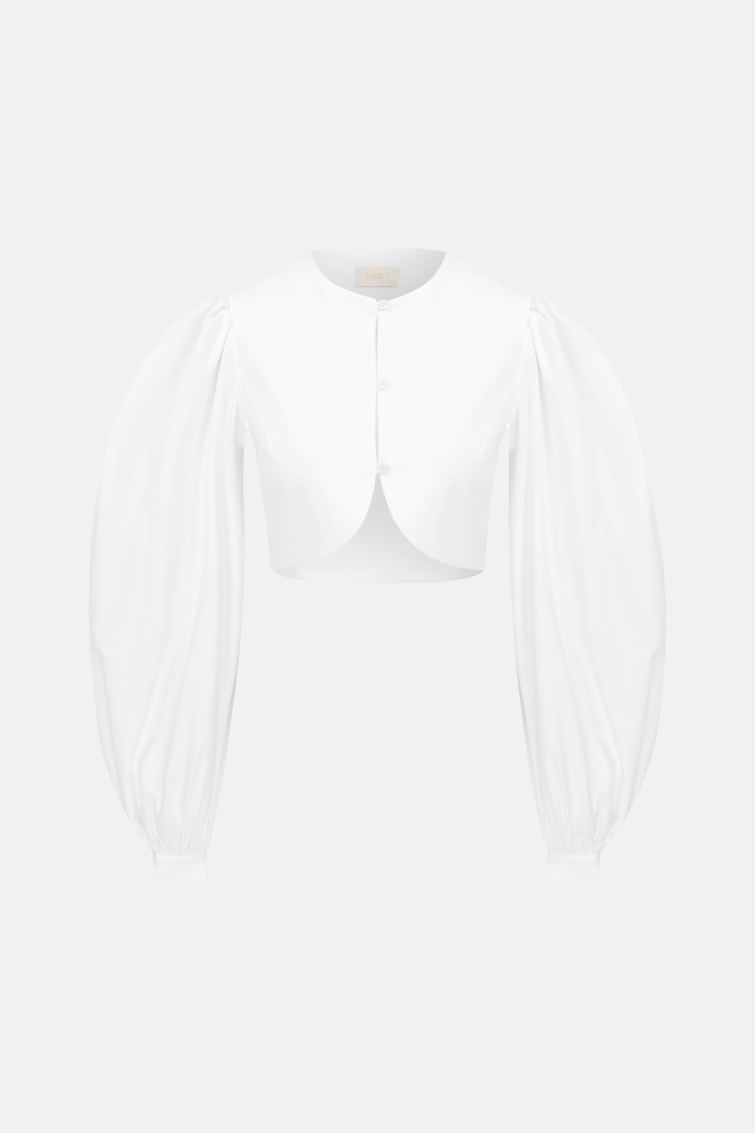 The Kiki Balloon‑Sleeved Shirt in white brings effortless refinement to your wardrobe with its cropped, round‑neck silhouette and dramatic balloon sleeves. Crafted from a blend of 56% cotton, 33% polyester and 3% elastane, the shirt offers structured comfort and modern flair. Perfectly versatile, it ... Read more pairs beautifully with tailored trousers for a sleek office look or with high‑waisted skirts and boots for a chic evening ensemble.