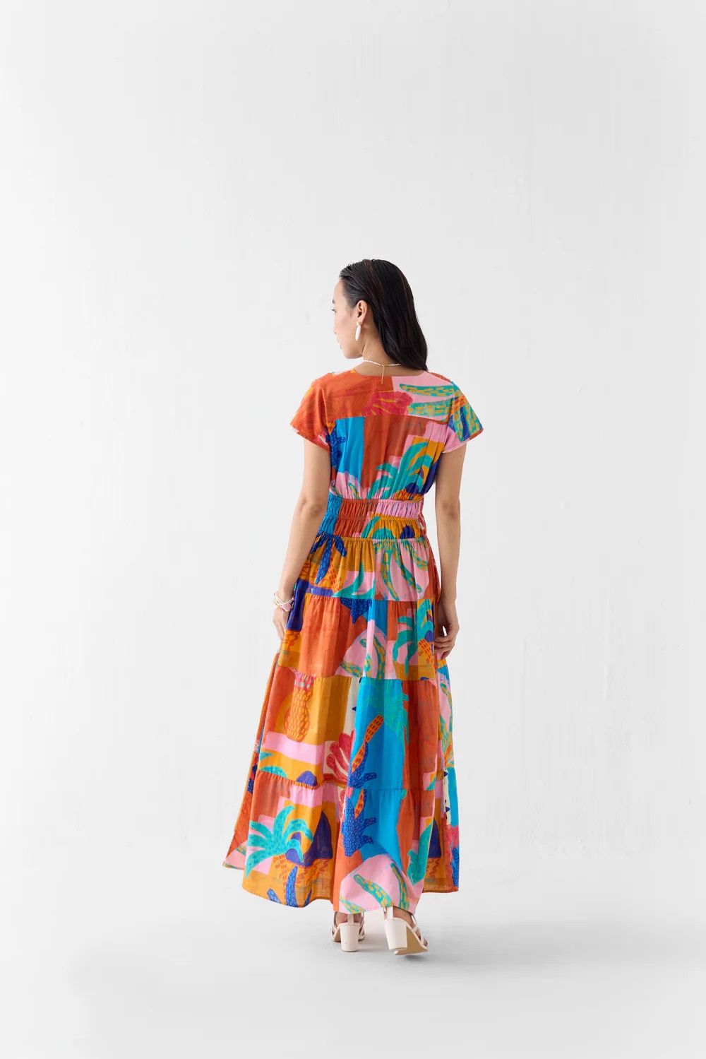 The Kota Cinched Waist Dress crafted from our 100% cotton fabrication, trans-seasonal, is a statement piece. The dress, made in our hand painted kota print, depicting the sunny morning in kota city, reflects fine artisanal craftsmanship. It is full length. With gathers all the way till the waist, ... Read more this dress has a cross front and drawstrings. Featuring a summery look, it has an A-line fit. Wear it with strappy heels for an elegant look. The model is wearing a Size S.