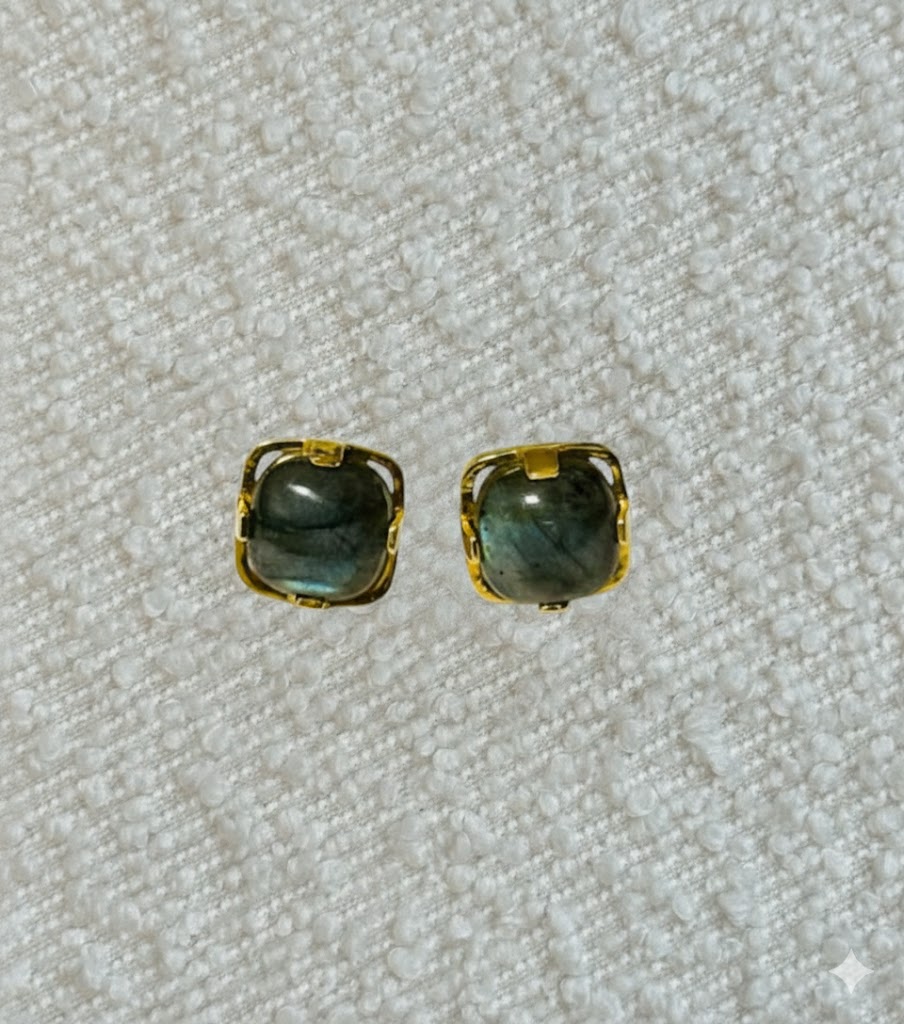 A simple yet striking pair of earstuds focusing upon a beautiful pair of square cushion shaped Labradorite mounted in a 4-claw setting. ... Read more