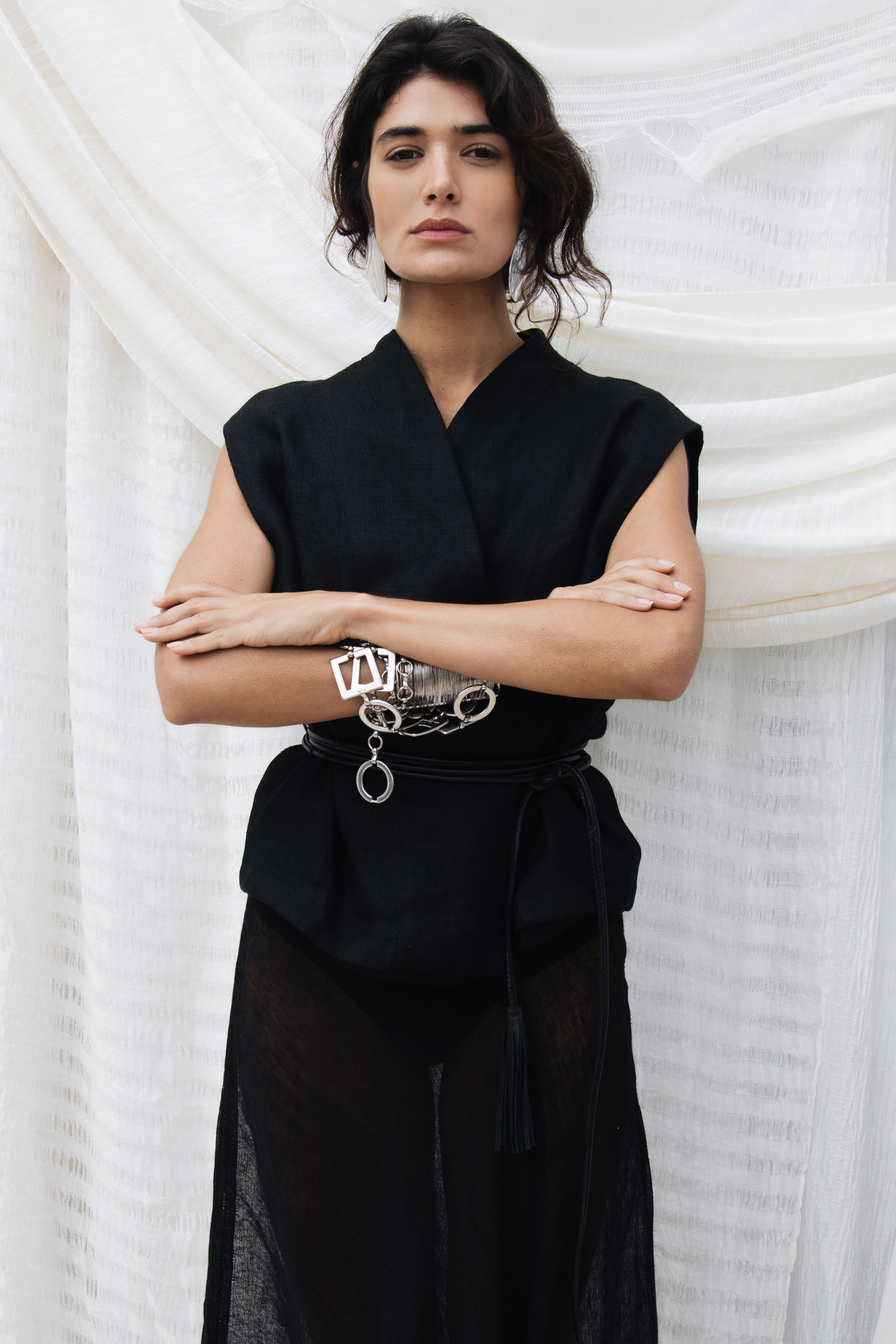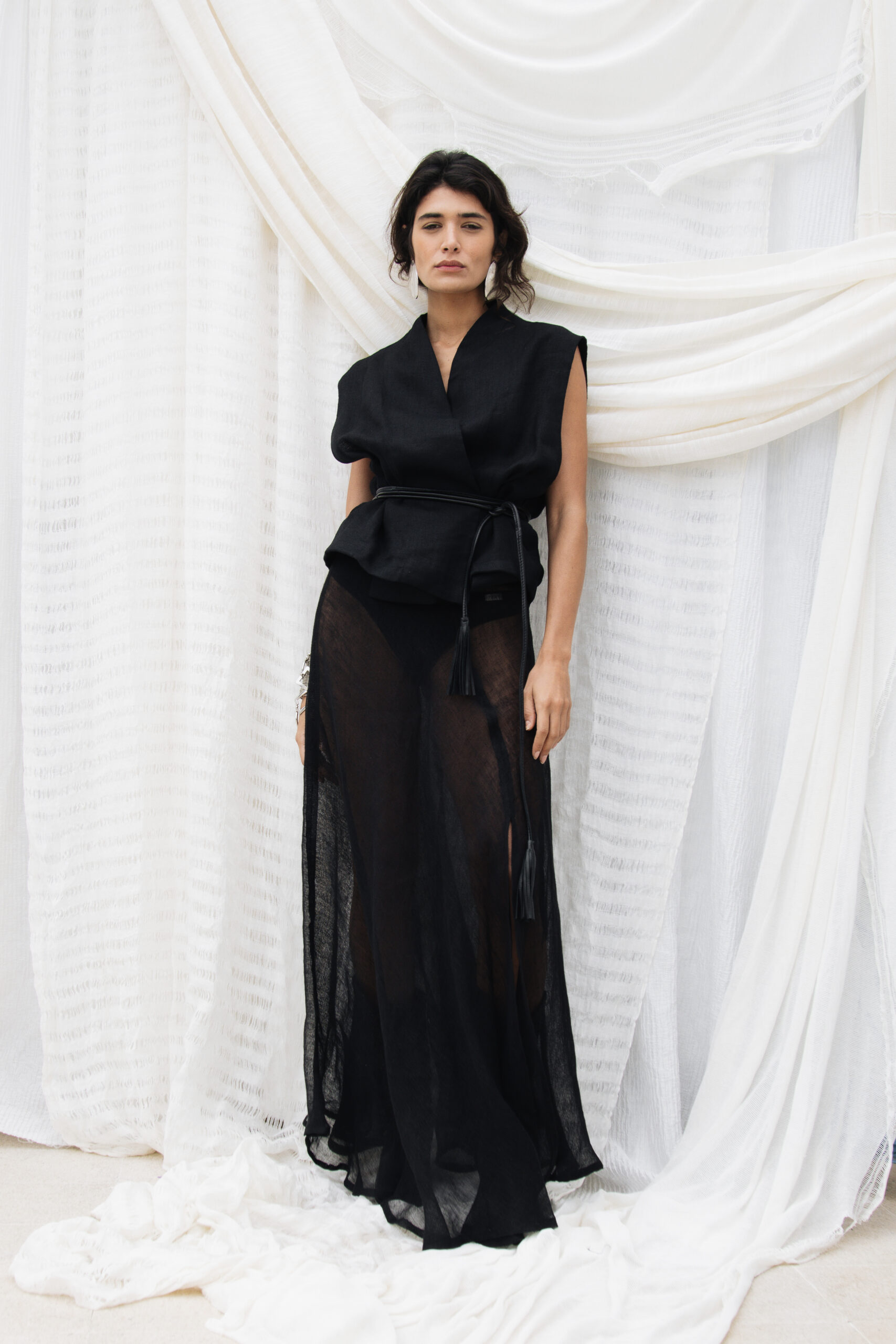 A breezy and versatile silhouette designed for effortless style, the Lagune Top features a sleeveless black linen wrap top with open sides and tie belt. Sculptural and strong, designed to layer or stand alone. Crafted from lightweight breathable fabric, it drapes beautifully and elevates both casual ... Read more and curated outfits. Perfect for warm weather styling, city days, or laid-back weekend looks.