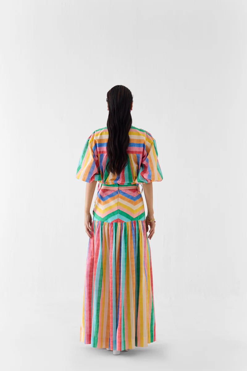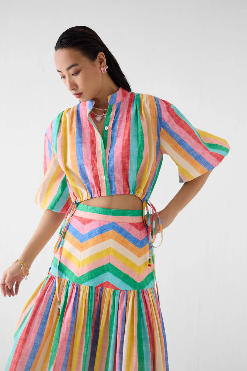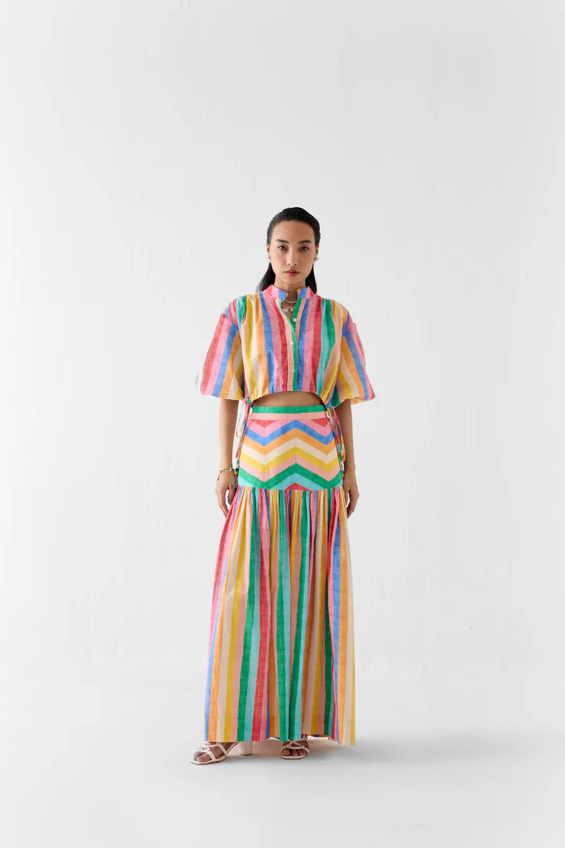 The Leher Drawstring crop shirt & Gathered Skirt Co-ord crafted from our stunning 100% cotton fabrication, trans-seasonal, is a statement piece. Made in our leher print inspired by the colours of the famous leheriya fabric of Jaipur, the set reflects fine artisanal craftsmanship. With a crop ... Read more shirt with balloon sleeves and a boxy fit, it has drawstrings on the side to adjust it. The back has a yoke and gathers. Featuring a summery look, it is paired with our leher gathered skirt with a zig zag yoke and a side zipper. Wear it with heels for an elegant look. Details: The model is wearing a Size S.