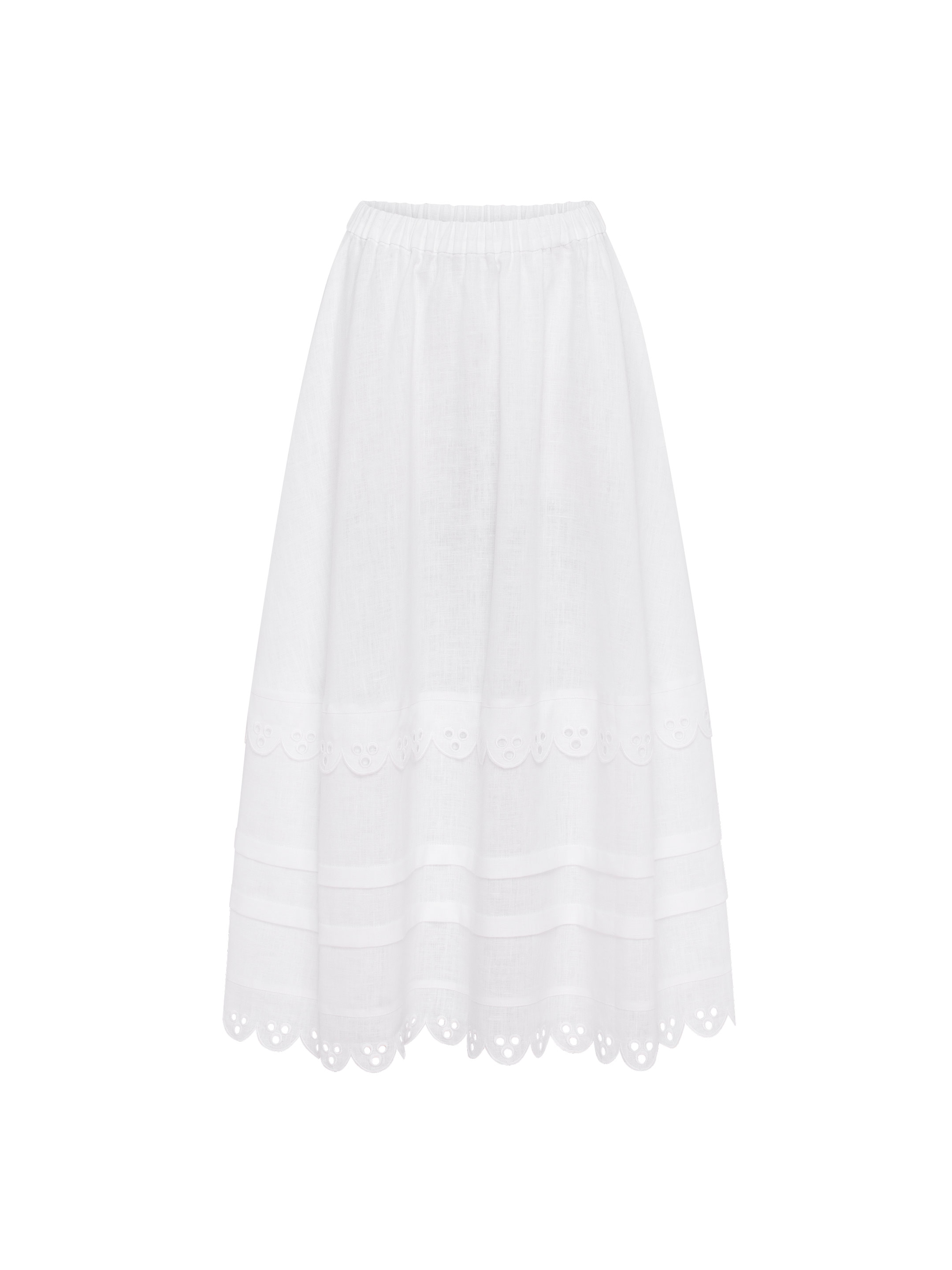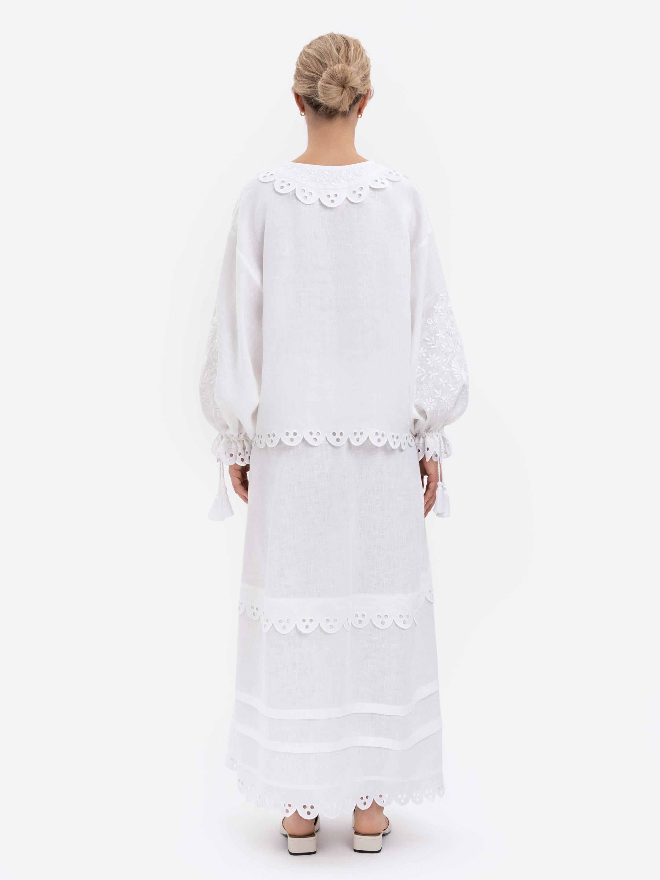 Minimalist white skirt made of linen. The skirt is fixed with an elastic band at the waist and smoothly expands to the bottom. In the center and bottom it is decorated with horizontal folds and openwork elements in the Richelieu technique. In combination with the Ivan-flower shirt, this product ... Read more creates a harmonious image.