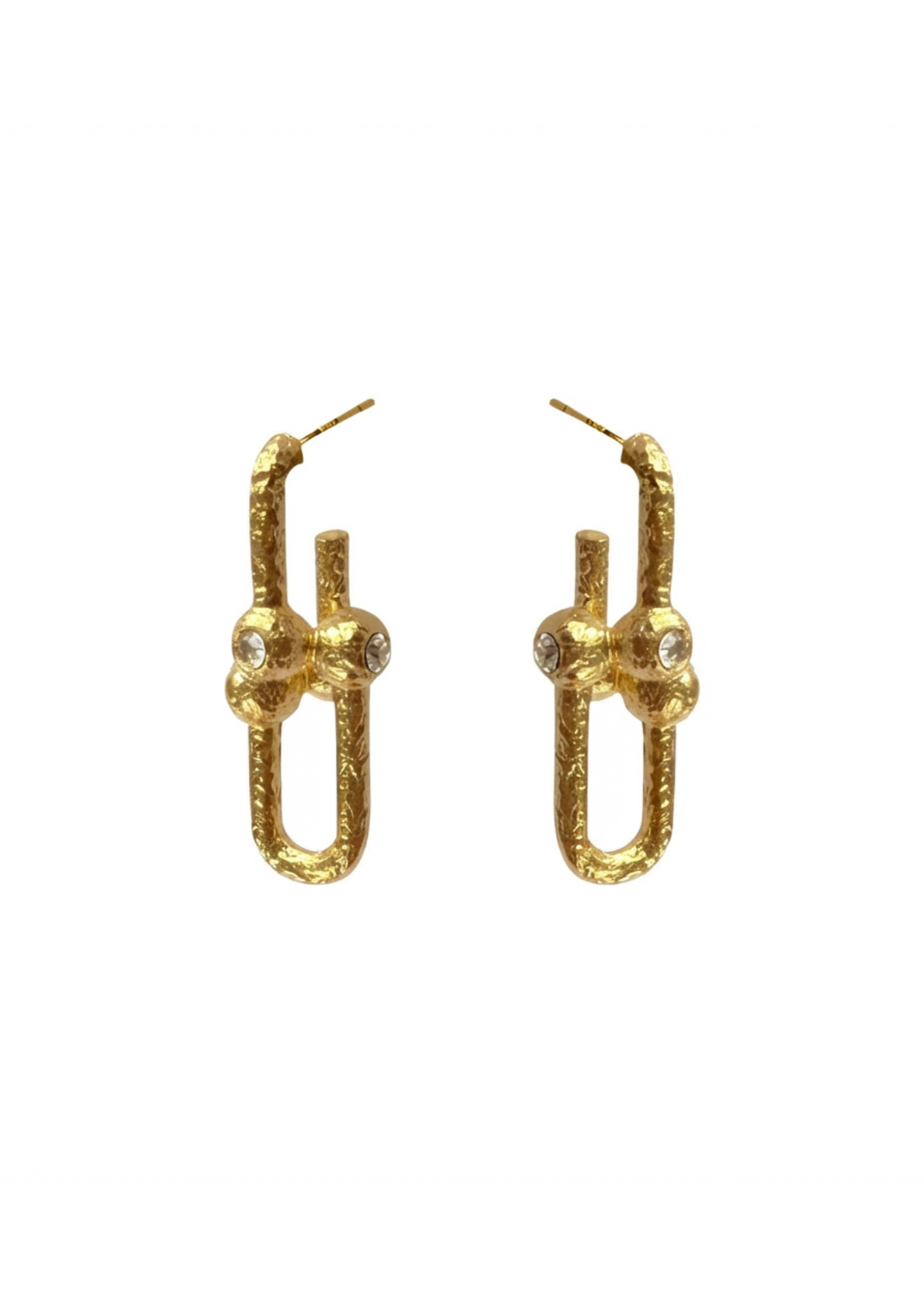 Crystal Link Earrings. Redefine your everyday style with the LINK Earrings. Featuring a bold, elongated carabiner-inspired silhouette, these earrings are defined by their unique hammered "molten gold" texture. Length: 3.5 cm. Made in Lebanon. ... Read more