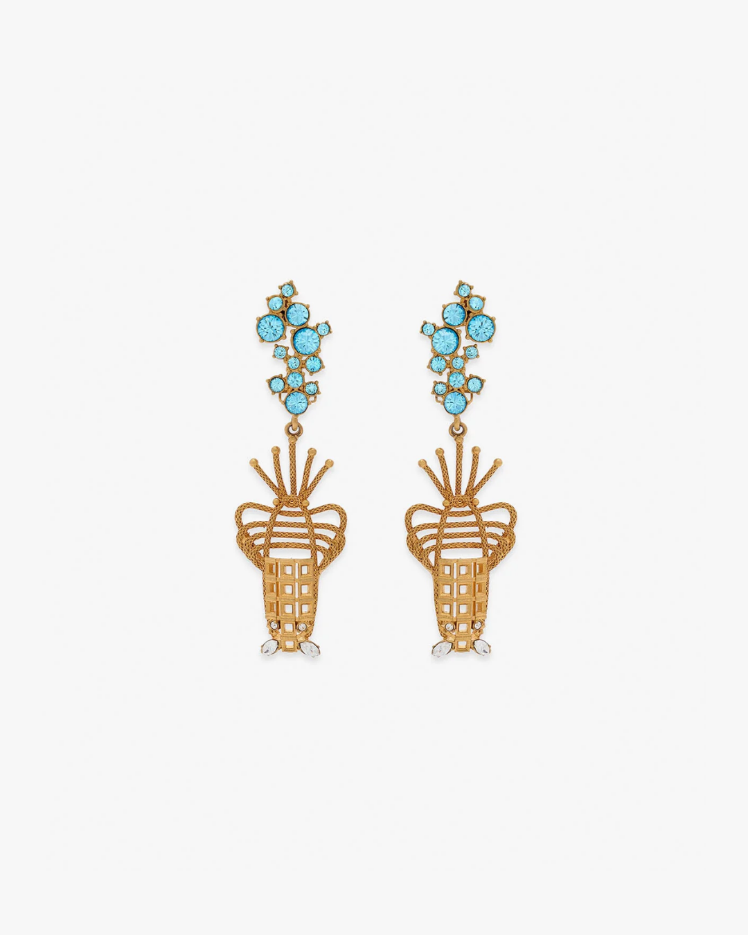 Handworked brass earrings, finished in a textured 24k gold overlay, payinf homage to the lobster a symbol of regeneration and protection and the signature of Sonia’s collection. Her unique, elegant aesthetic appeals to those with a cool, fashion-forward sensibility, while simulated light-blue ... Read more aquamarines mimic air bubbles and sparkling Swarovski crystal accents complete each statement design.