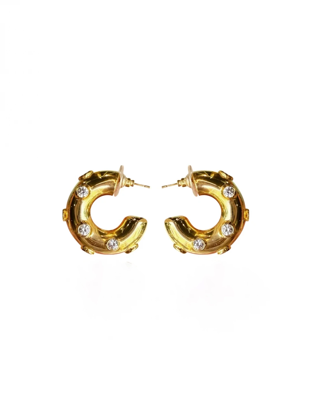 The LOOPI earrings feature a sleek, rounded hoop design with a smooth 24K gold-finished surface and subtle strass accents that add a refined touch of sparkle. Made with a durable copper base and measuring approximately 3 cm, they offer a lightweight, comfortable fit while still delivering a ... Read more bold, polished look. Their modern shape and glossy finish make them an easy, versatile accessory that pairs effortlessly with both everyday outfits and dressier styles.