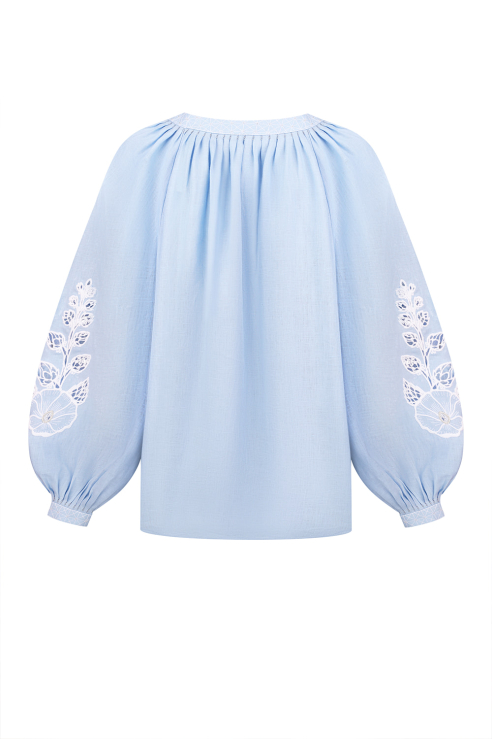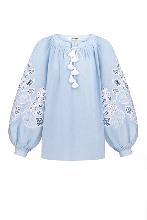 An elegant blouse for delicate looks. The “Malva” collection is inspired by a Ukrainian flower, a symbol of love, family, and spiritual roots. The embroidered flowers on the sleeves are enhanced with elements of dimensional embroidery. The neckline and cuffs are adorned with beads and delicate ... Read more gathers, while the tassels are handmade. The minimalist contrast of white embroidery on blue creates a refined accent.