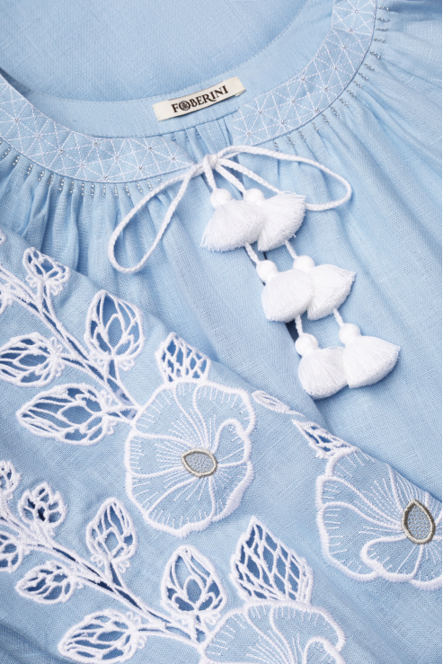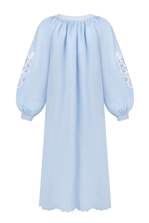 An elegant dress that creates a refined look for a special occasion. The “Malva” collection is inspired by the Ukrainian flower, a symbol of love, family heritage, and spiritual roots. The embroidered flowers on the sleeves are enhanced with elements of three-dimensional embroidery. The neckline and ... Read more cuffs are adorned with beads and delicate gathers, while the tassels are handmade. The minimalist contrast of white embroidery on blue creates a soft, graceful accent.