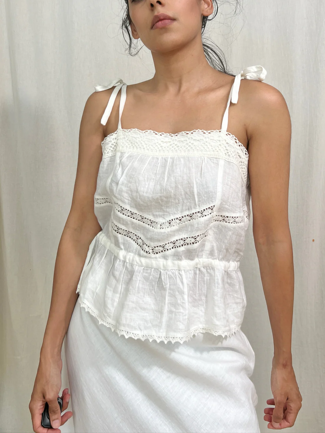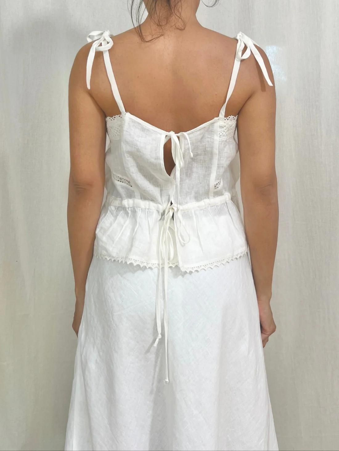 Meadow top is crafted in 100% cotton fabric and adorned with delicate linen lace details. The top features an open back detail with tie-ups, knotted straps and an adjustable waist. ... Read more