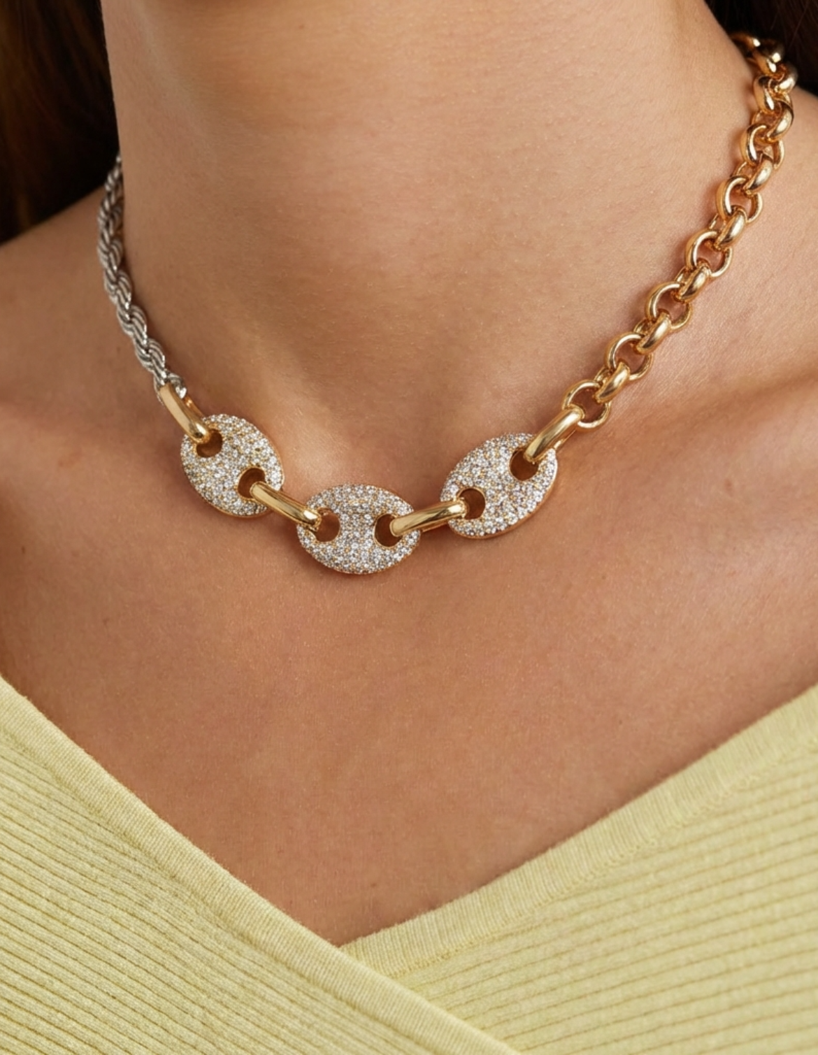 The 'More is More' chain - a statement that your closet should live by. The dual tone necklace features an 18K gold plated chain with a sterling silver cord chain. As an extra cherry on top, the 'More is More' chain features 3 crystalized coffee bean links which makes it the ultimate accessory. ... Read more Chain length is adjustable so it can be worn as a choker or layered with the 'OG' chain.